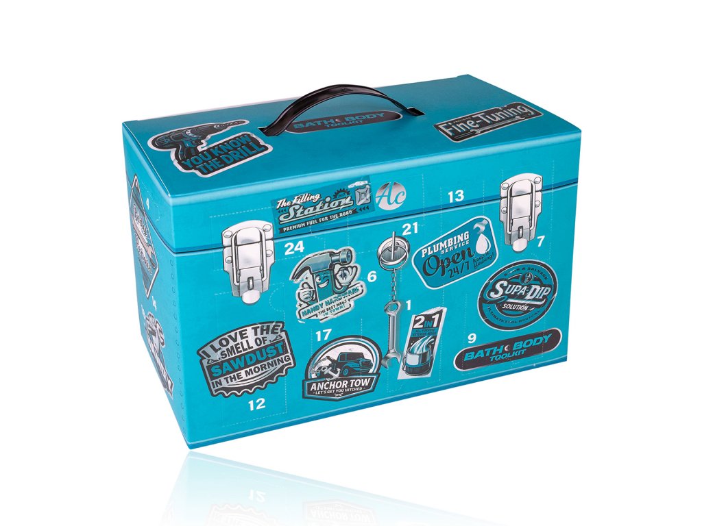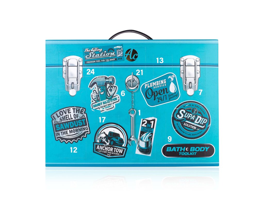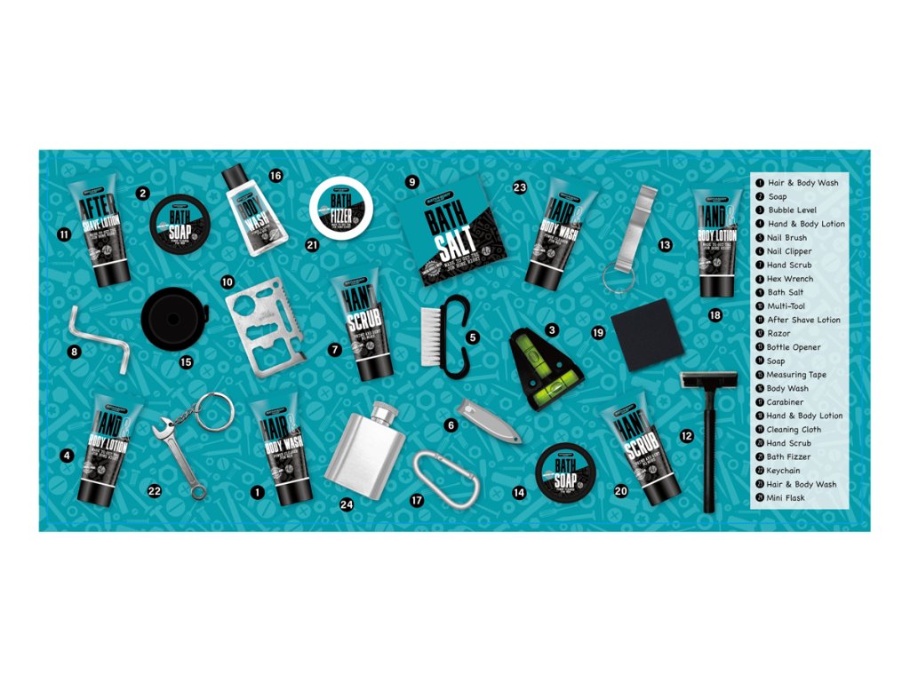 Kalendář kombinuje pečující kosmetiku a praktické nástroje pro každého muže: