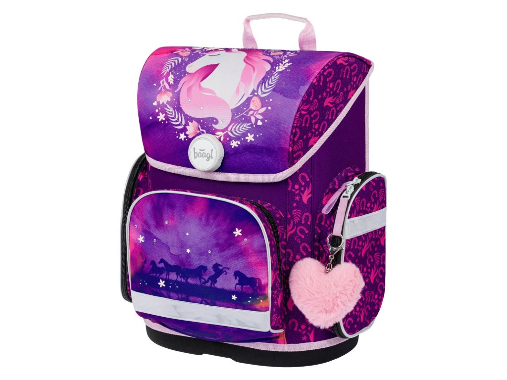 Ergonomická školní aktovka vhodná pro 1. a 2. ročník základních škol. Zdravý batoh, speciálně vyrobený pro potřeby nejmladších žáků. Aktovka Kůň ve fialové barvě s chlupatým přívěskem ve tvaru srdíčka.