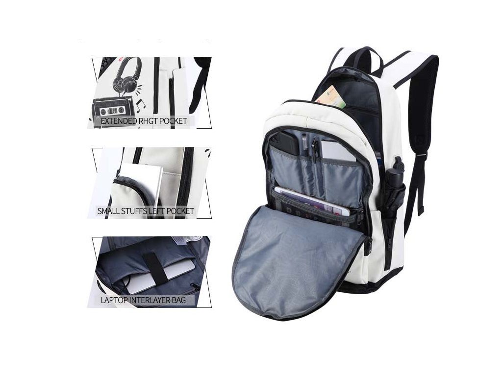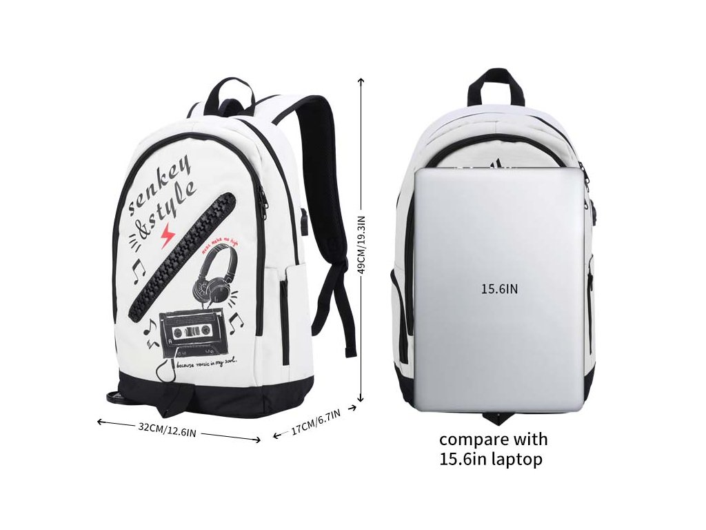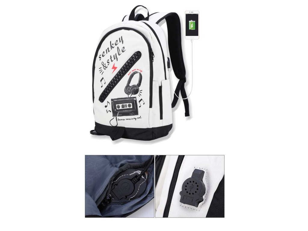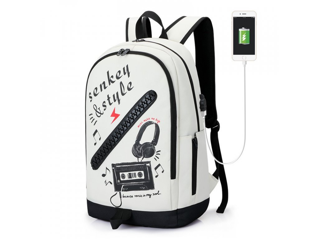 Moderní školní batoh pro teenagery s USB portem značky Senkey & Style - Music v bílém provedení.