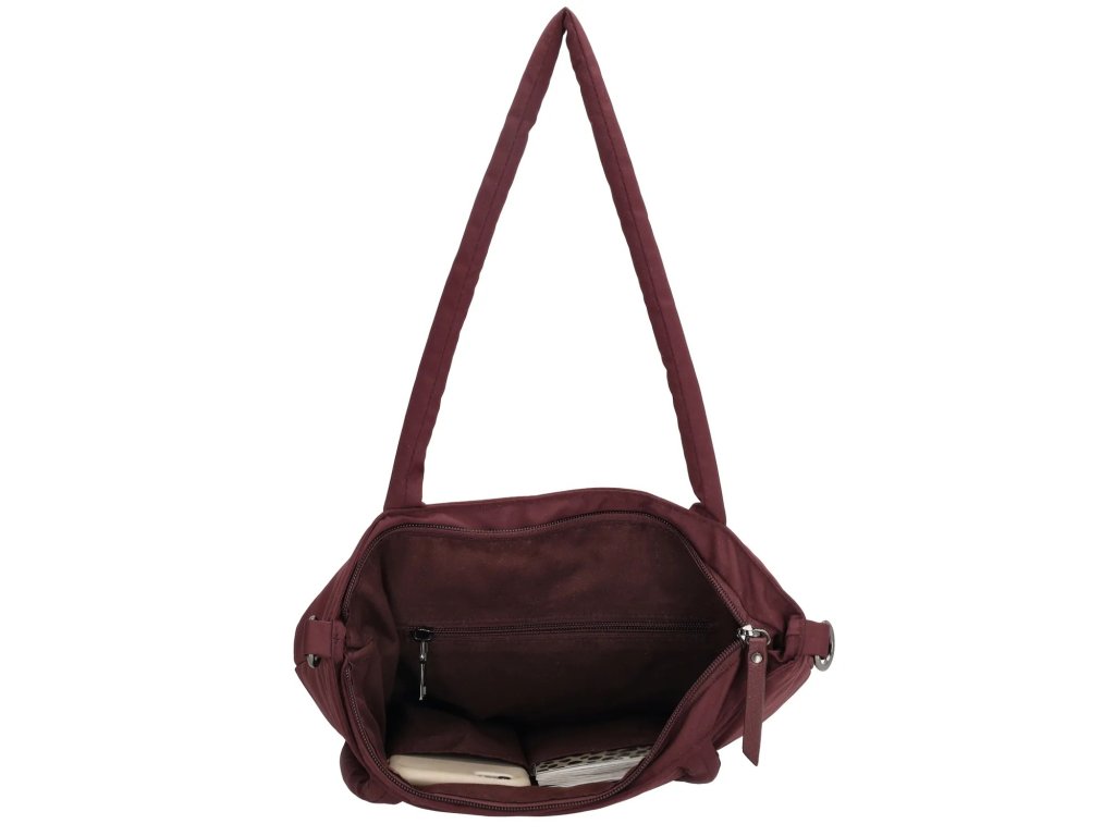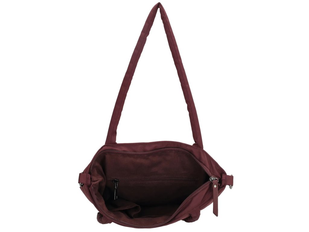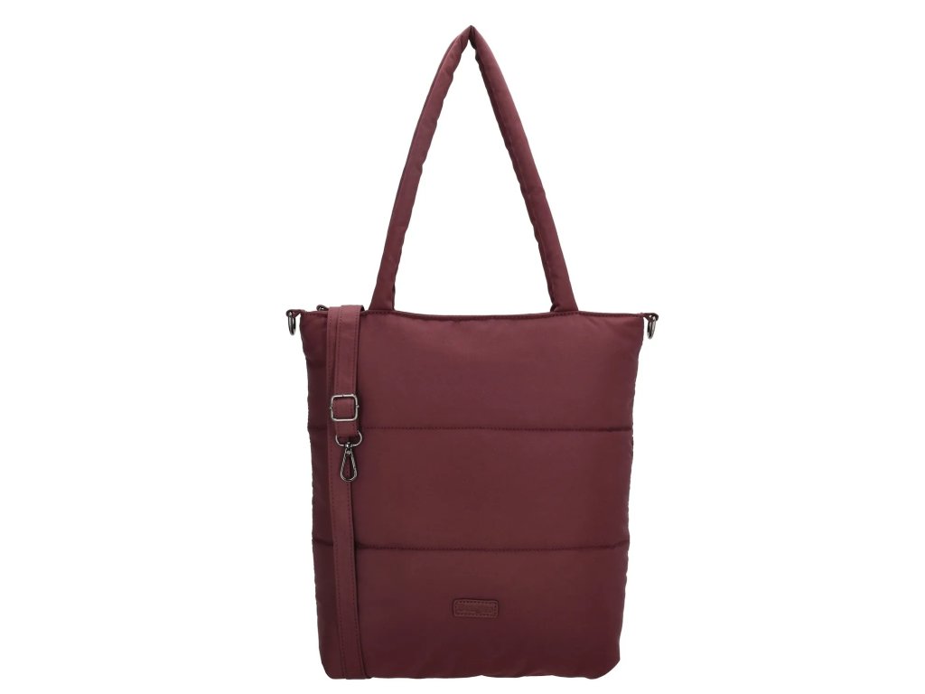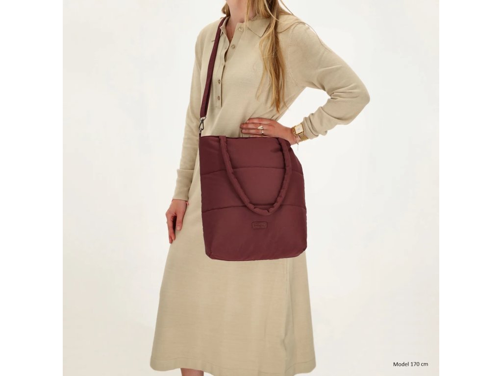 Taška je vyrobena z odolného nylonu a polyesteru, což zajišťuje její dlouhou životnost i snadnou údržbu. Jemné prošívání dodává elegantní vzhled a vínová barva působí nadčasově a sofistikovaně.
