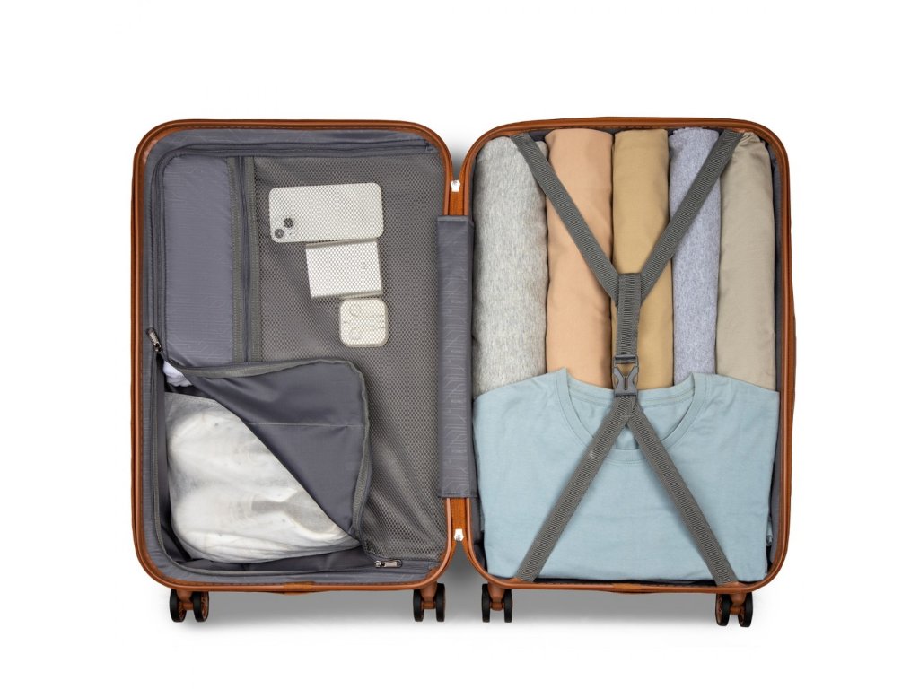 - 🔐 TSA zámek: Bezpečné uložení obsahu s možností letištní kontroly bez poškození kufru.