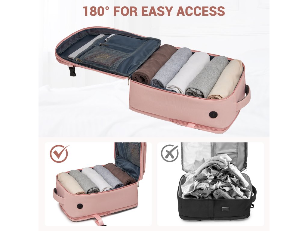 - 🧳 Otevírání jako kufr: Hlavní komora s 180° otevíráním umožňuje přehledné balení jako u malého cestovního kufru - ideální na víkendové pobyty i služební cesty.