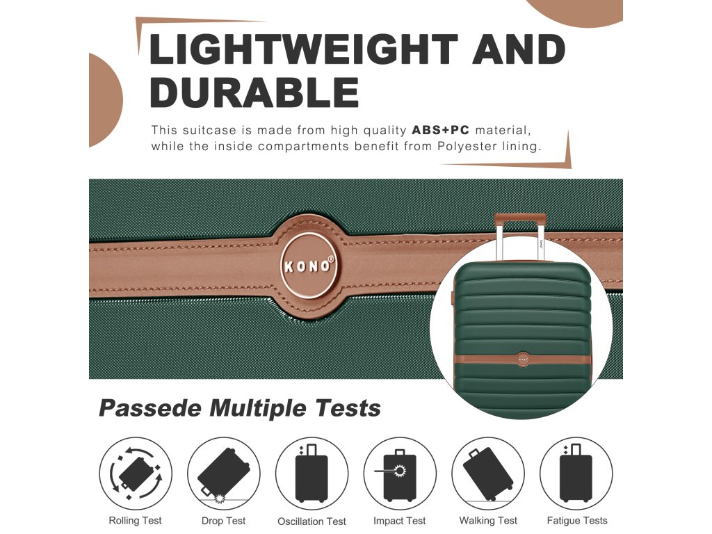 - 🎨 Moderní design: Pruhovaný vzhled s barevnými blokovými detaily a logo KONO dodávají kufru výrazný a elegantní charakter.