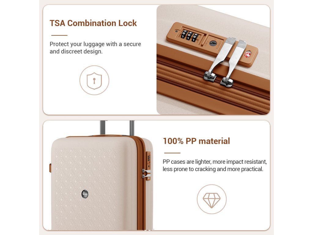 Kufry z polypropylenu patří mezi nejoblíbenější volbu současných cestovatelů díky své odolnosti a nízké váze. Tento model Kono v elegantní béžovo-hnědé kombinaci je perfektní na obchodní cesty, víkendové pobyty i rodinné dovolené. Spojuje moderní vzhled, chytré funkce a dlouhou životnost.