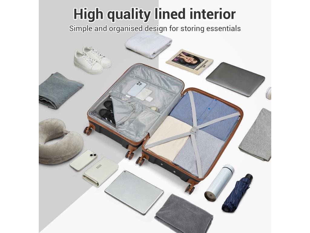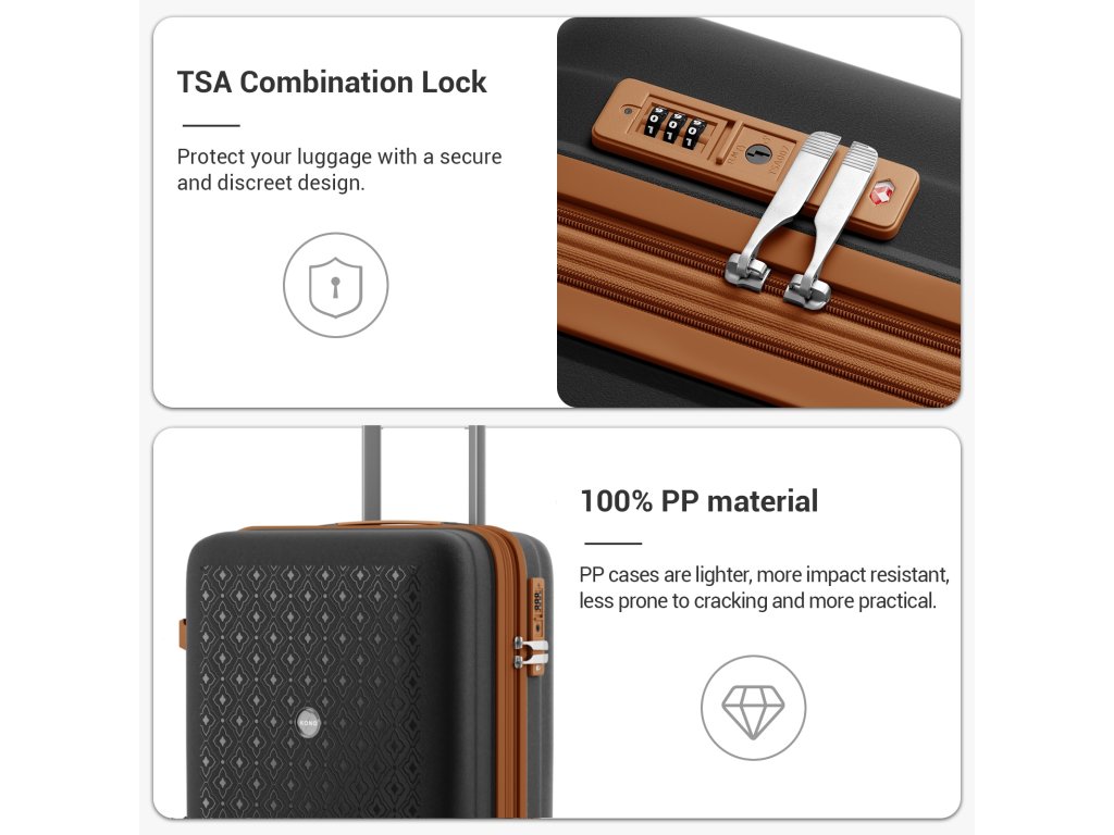 Kufry z polypropylenu patří mezi nejoblíbenější volbu současných cestovatelů díky své odolnosti a nízké váze. Tento model Kono v elegantní černo-hnědé kombinaci je perfektní na obchodní cesty, víkendové pobyty i rodinné dovolené. Spojuje moderní vzhled, chytré funkce a dlouhou životnost.