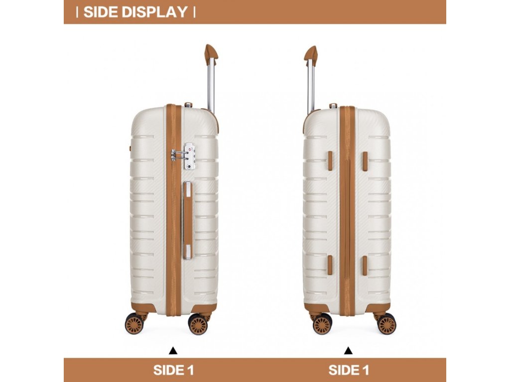 - Doplňkové rukojeti: Horní a boční madla usnadňují manipulaci. Na boční straně kufru jsou čtyři plastové podložky, které umožňují kufr pohodlně postavit.