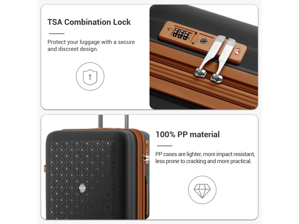 - Tvrdý skořepinový kufr z polypropylenu – odolný vůči poškození a dlouhodobě spolehlivý.