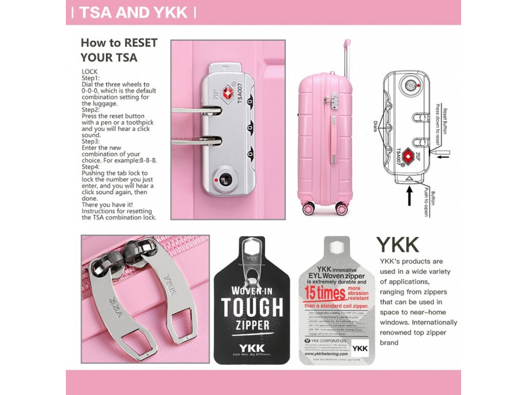 Pevný zámek se 3 číselníky akceptovaný TSA, který nabízí maximální bezpečnost. Tento zámek umožňuje odemknutí a kontrolu zavazadel bezpečnostními orgány bez poškození.