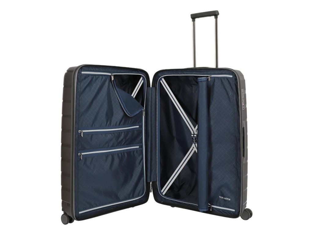 Vnitřní prostor je rozdělený do dvou částí s oboustranným balicím systémem. Kompresní popruhy v obou částech pomáhají udržet oblečení na svém místě. Dvě dělicí příčky na zip umožňují oddělit obuv, doplňky nebo kosmetiku, zatímco dvě vnitřní kapsy na zip poskytují dostatek prostoru pro drobnosti. Celý interiér je doplněn kvalitní textilní podšívkou, která chrání uložené věci a dodává kufru elegantní vzhled.
