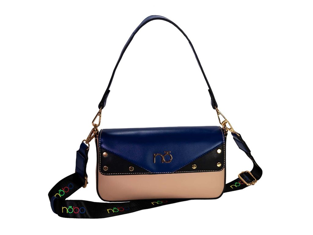Náramně povedená dámská crossbody designová kabelka značky NOBO v béžově modré barvě s barevným popruhem bude na vás doslova zářit.