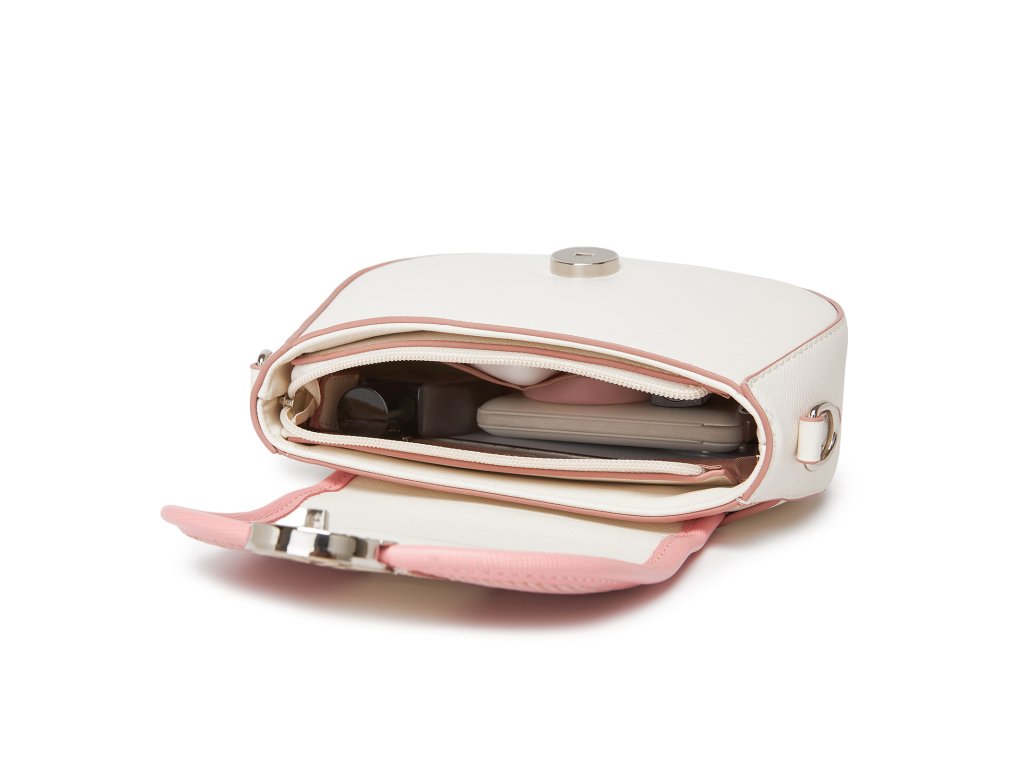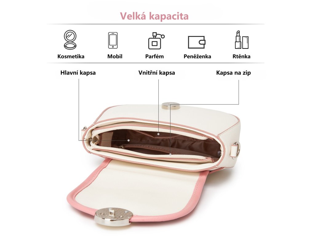 Kabelka nabízí hlavní přihrádku se zipem, kterou chrání i elegantní klopa s ozdobným kovovým zapínáním. Dvojitý bezpečnostní systém zabraňuje nechtěnému otevření a chrání vaše osobní věci. Uvnitř se nacházejí dvě kapsy - otevřená přihrádka vpředu pro telefon nebo klíče a zadní kapsa na zip pro peněženku či drobnosti. Vše tak máte přehledně uspořádané a po ruce.