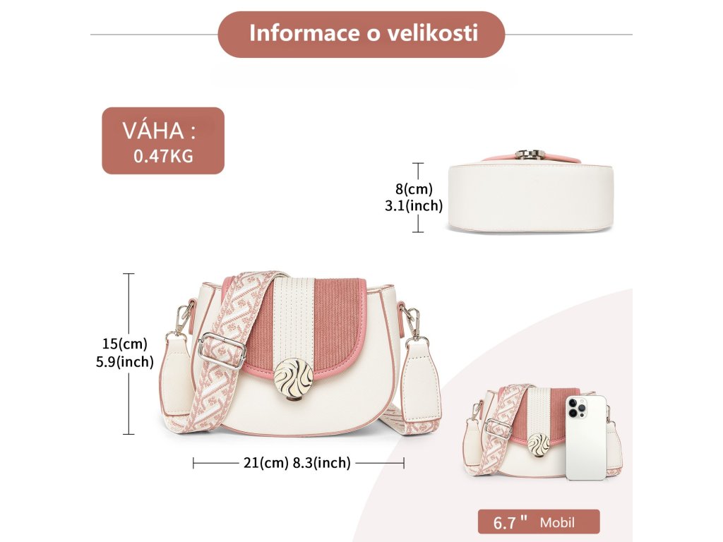 Součástí kabelky je široký ramenní popruh s etno motivy, který je nejen pohodlný, ale i stylově výrazný. Díky nastavitelné délce od 87 do 132 cm ji můžete nosit jak přes rameno, tak jako crossbody. Popruh dodává kabelce osobitost a činí ji ideálním doplňkem k boho i městskému outfitu.