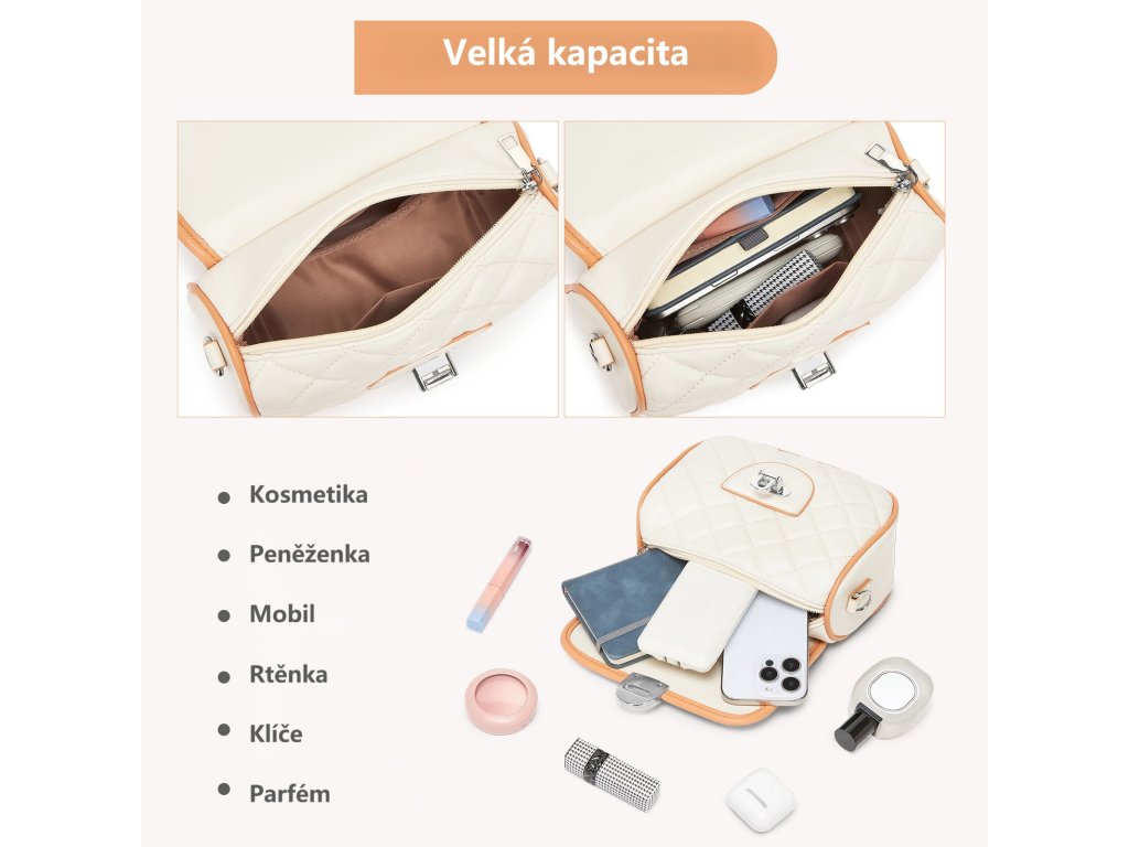 Uvnitř kabelky najdete přední otevřenou kapsu pro drobnosti, které potřebujete mít po ruce, a zadní kapsu na zip pro bezpečné uložení peněženky nebo klíčů. Díky promyšlenému uspořádání se do kabelky vejde vše potřebné - mobil, kosmetika, parfém i menší diář.