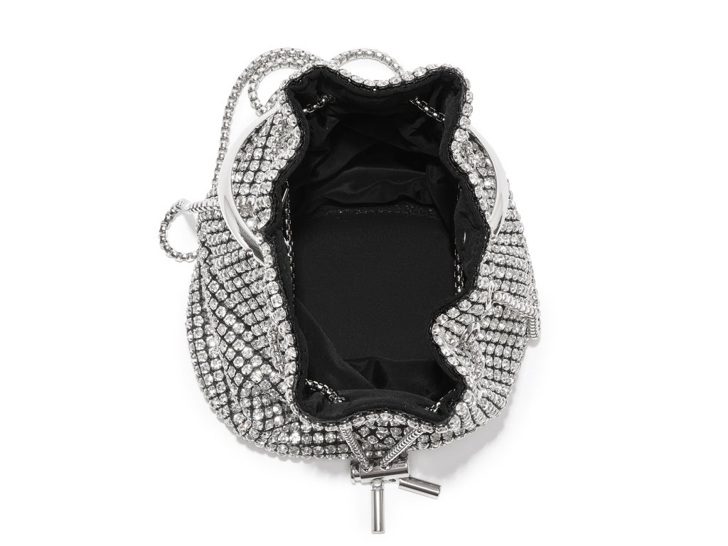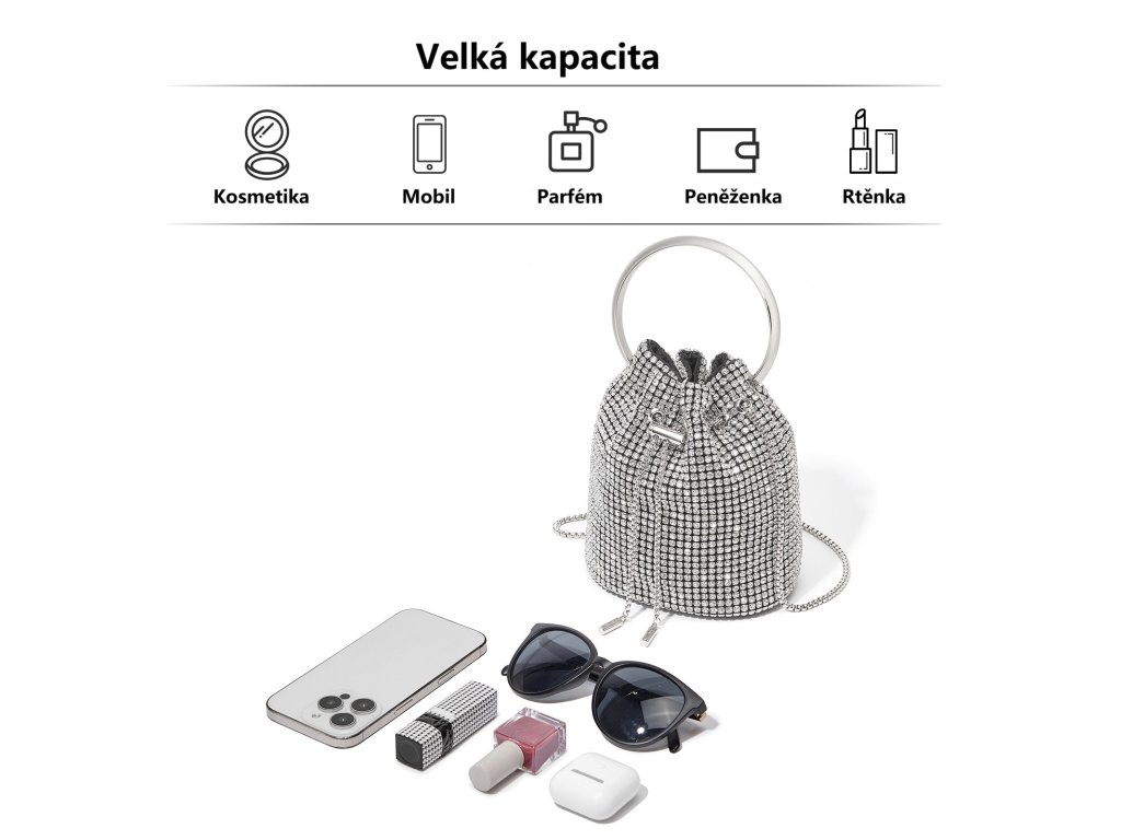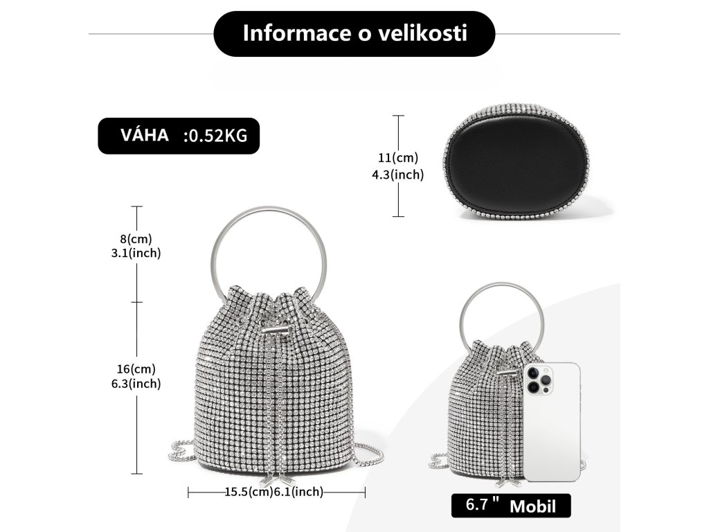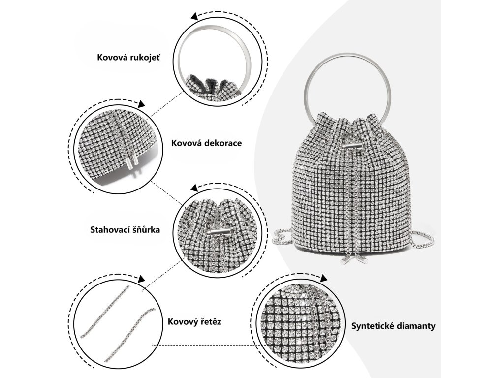 Tělo kabelky je pokryto drobnými syntetickými diamanty, které odrážejí světlo a vytvářejí fascinující třpytivý efekt. Spodní část z pevné PU kůže dodává tvar a stabilitu, takže kabelka si zachovává svůj elegantní vzhled i při častém používání. Stříbrné kovové doplňky doplňují celkový lesk a dodávají jí punc luxusu.