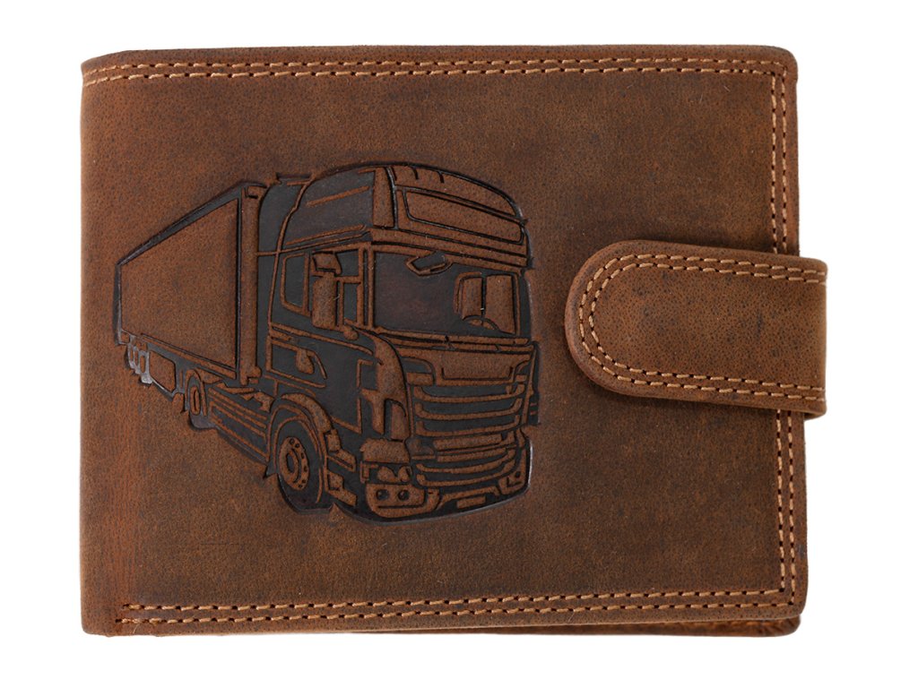 Ručně vyrobená peněženka z pravé hnědé kůže, která vydrží i náročné zacházení. Dominantou je precizně vyražený motiv tahače.