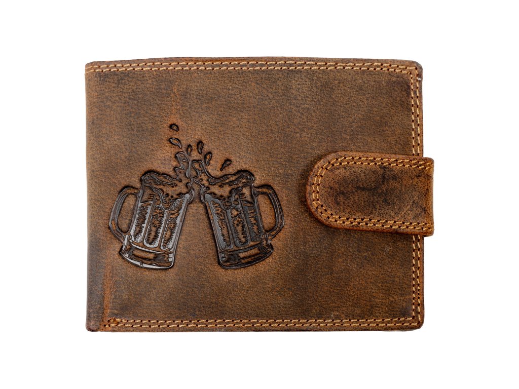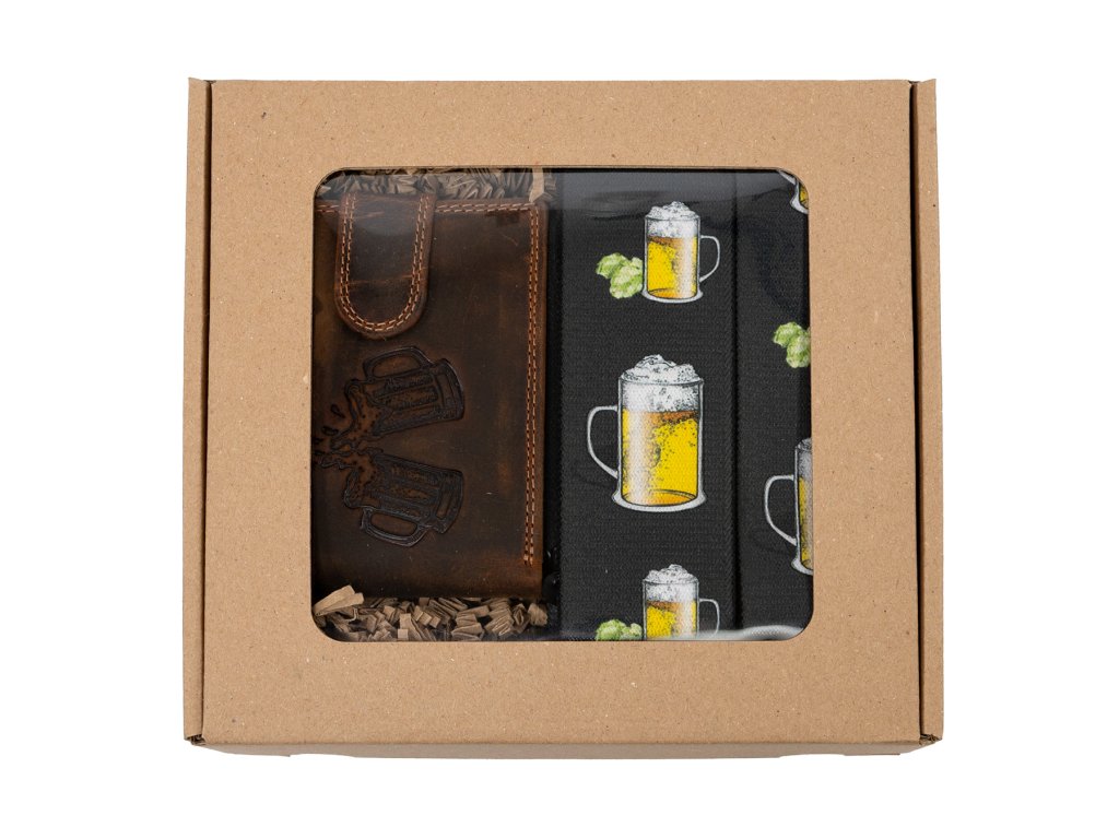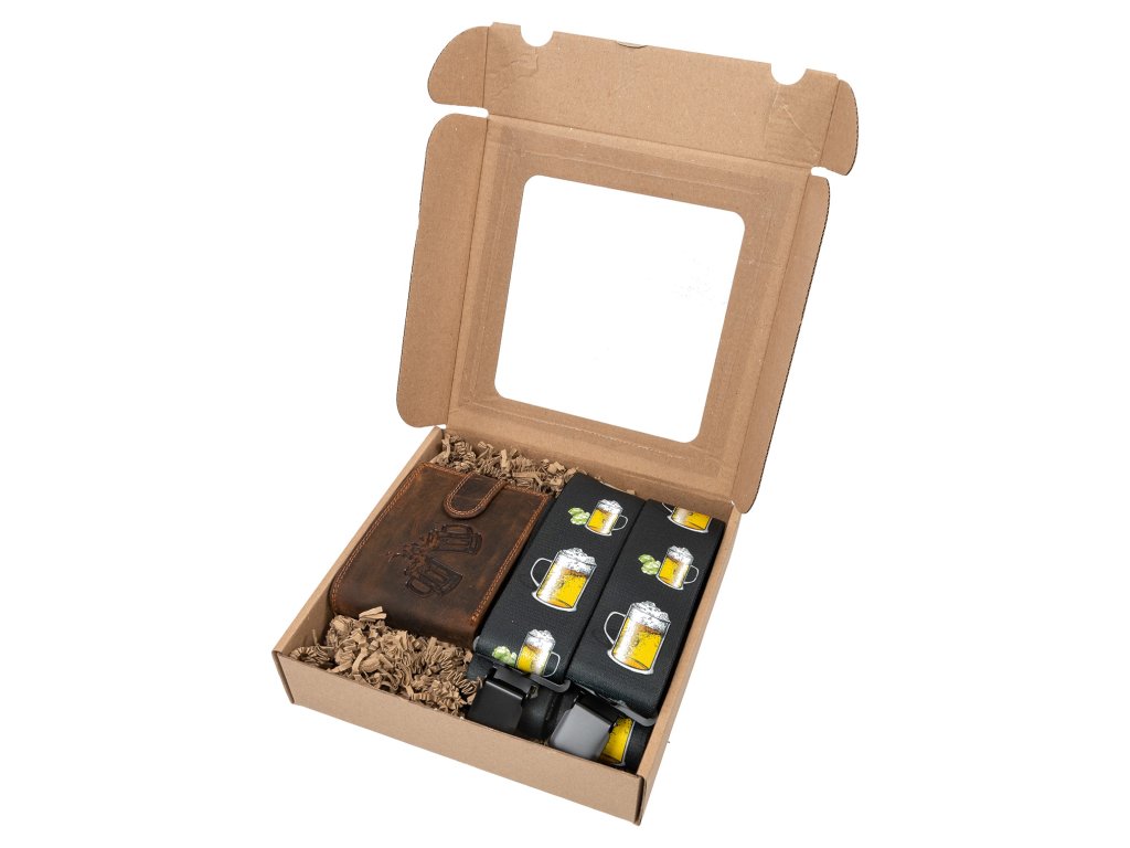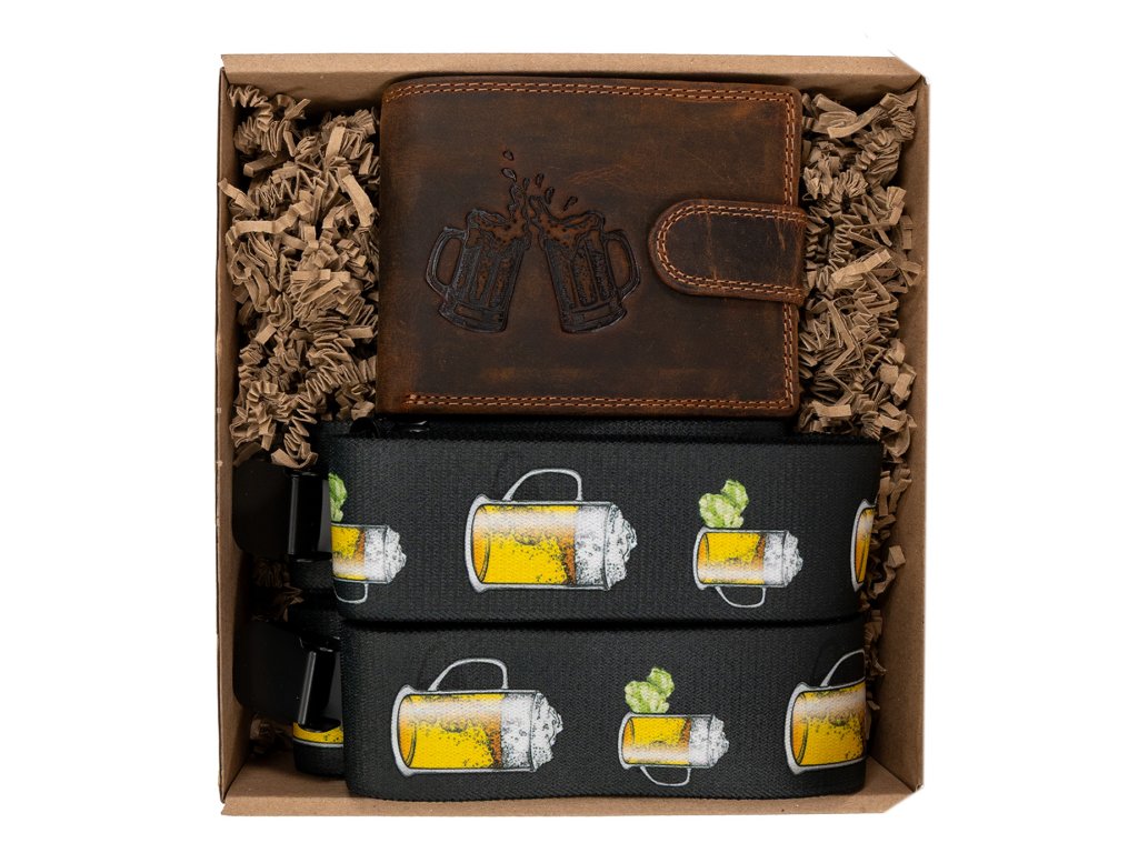 Dárkový set pro muže - Kožená peněženka s přezkou a kšandy - Pivo