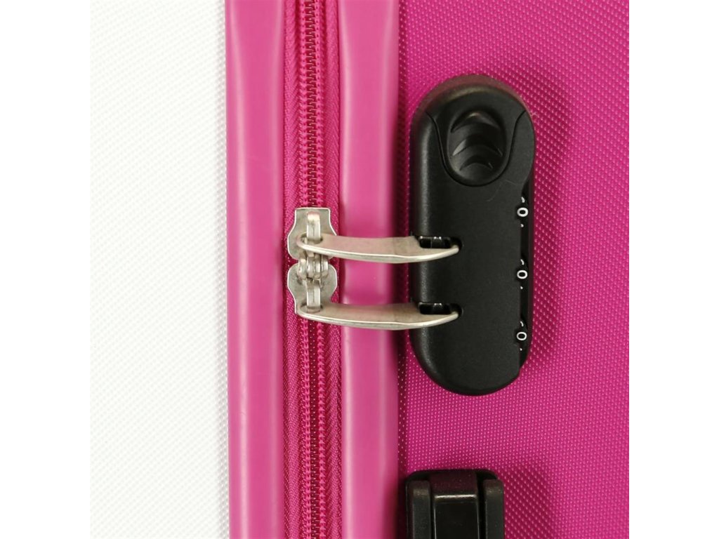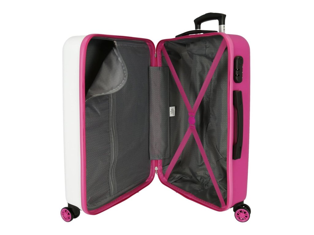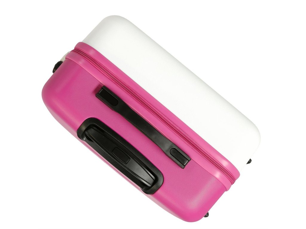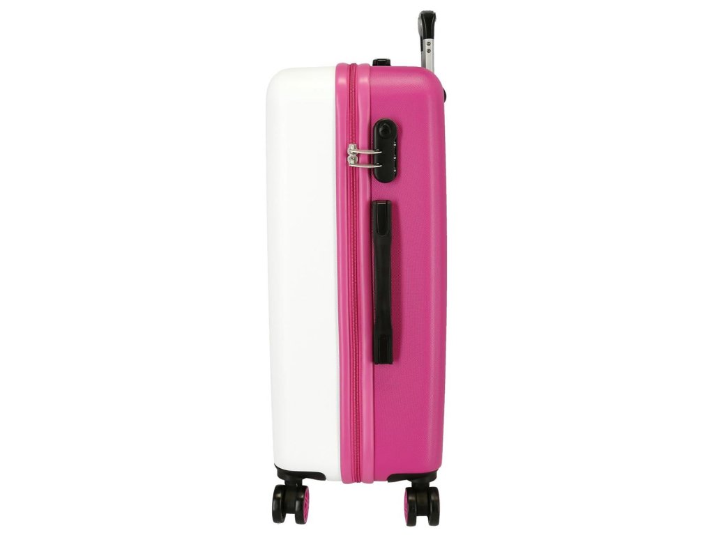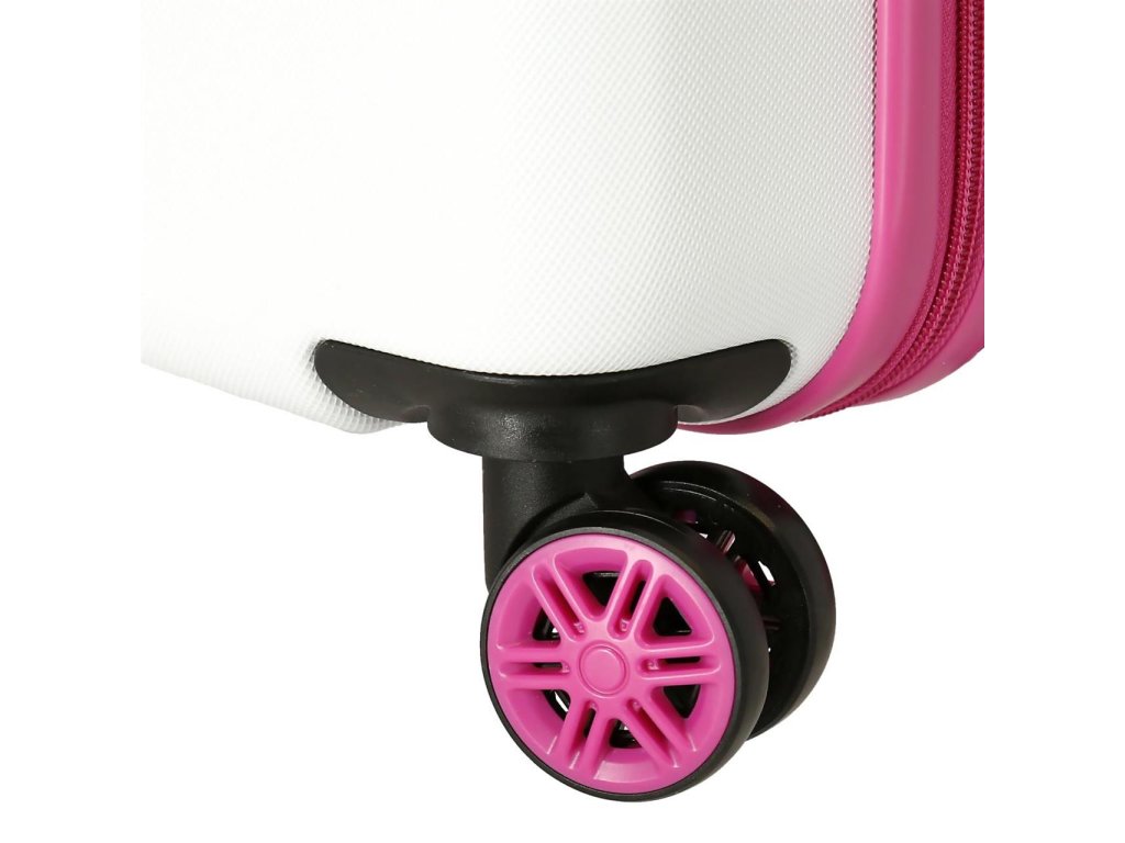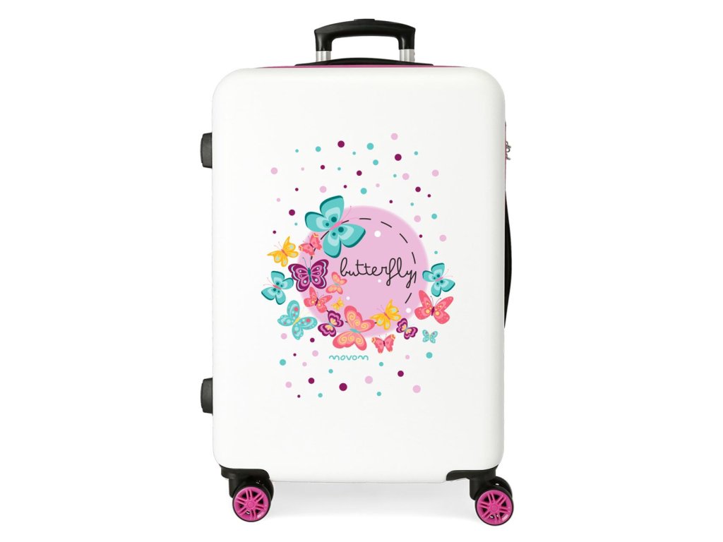 Praktický a velice stylový kabinový kufr na čtyřech otočných kolečkách s výsuvnou rukojetí značky MOVOM z kolekce Butterfly Happy Time v bílém provedení. 70L