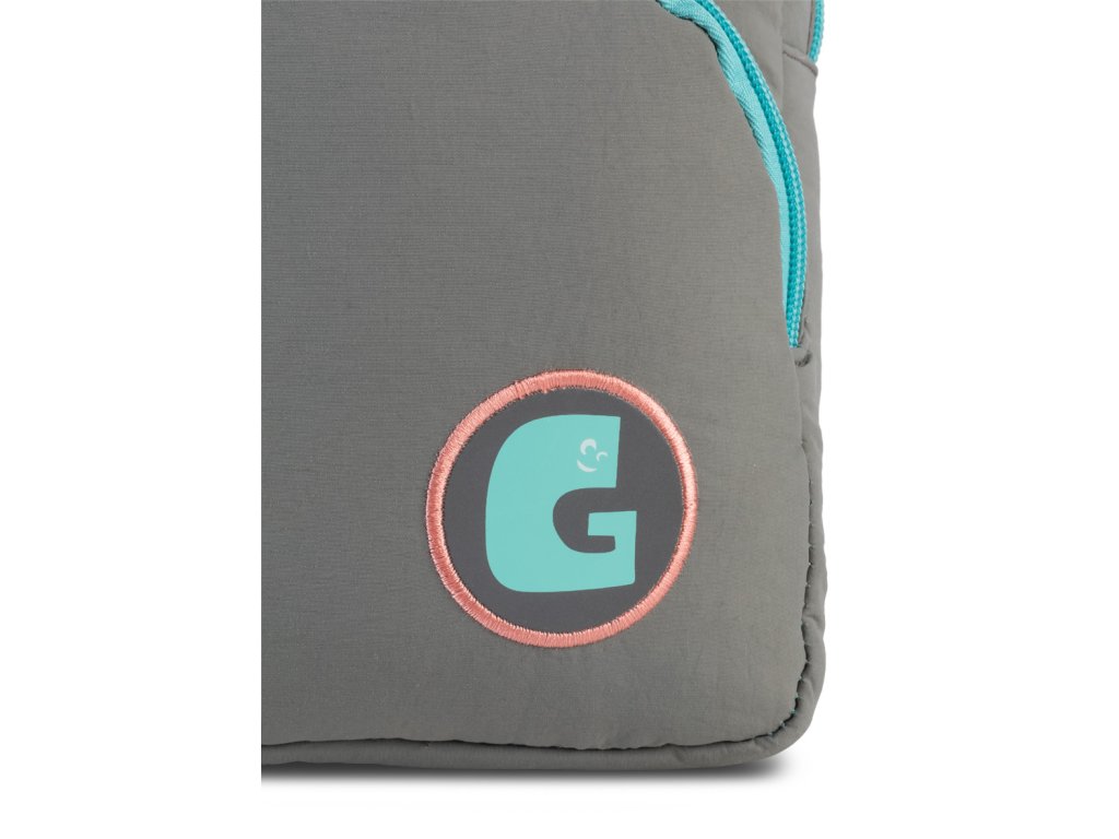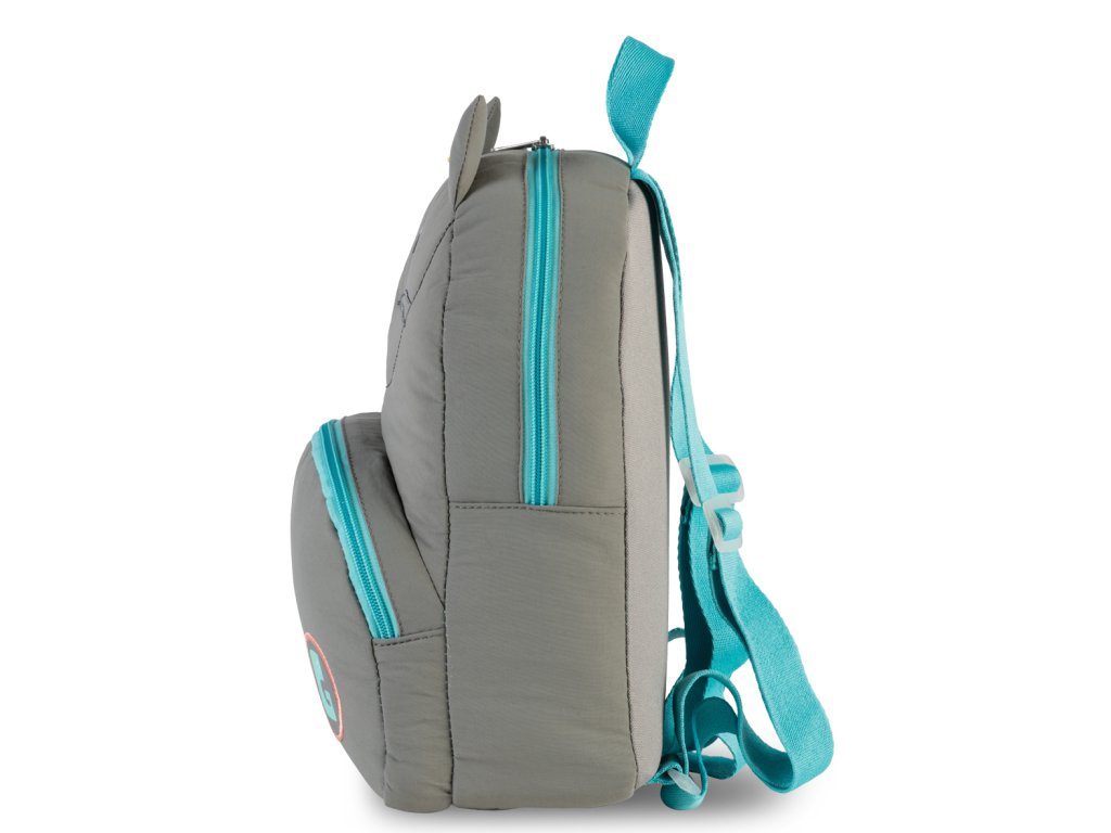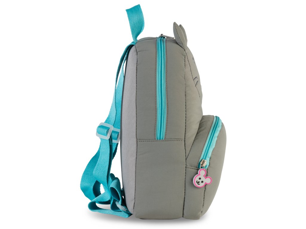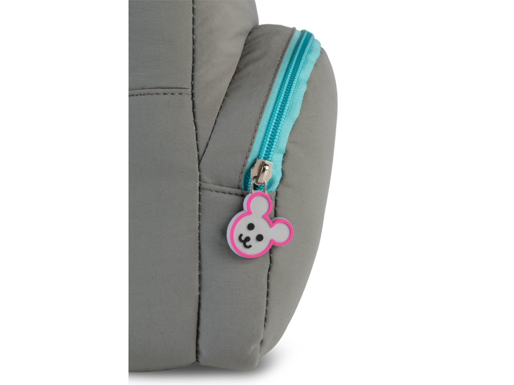 - Barevné detaily: Tyrkysový zip a růžový přívěsek ve tvaru zvířátka.