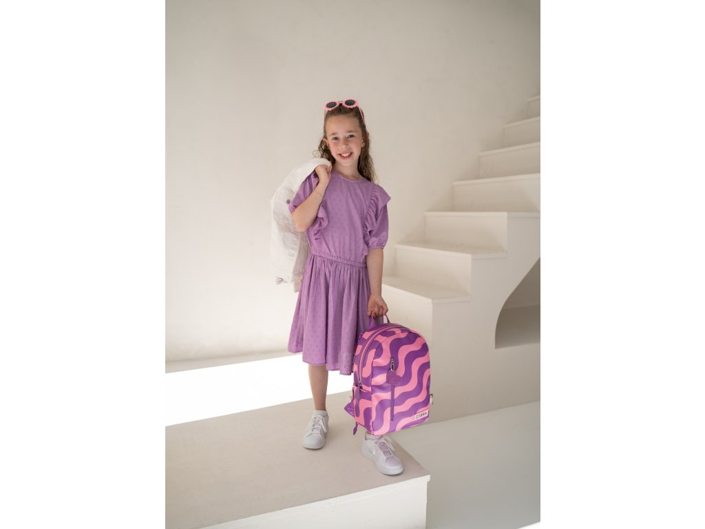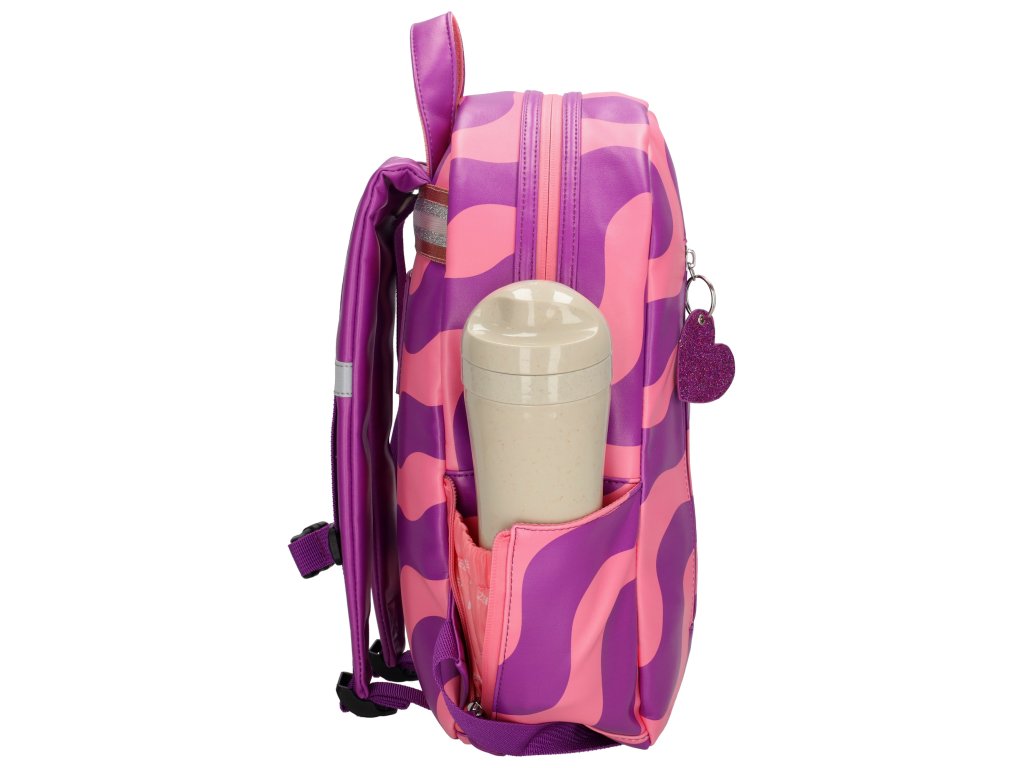 Batoh nabízí hlavní prostornou přihrádku s několika menšími vnitřními kapsami pro lepší organizaci. Vejde se sem svačinový box, láhev na pití, školní potřeby nebo hračky. Na bocích najdete dvě kapsy na láhev, zatímco vpředu je kapsa na zip s přívěskem ve tvaru srdce, která poslouží na drobnosti.