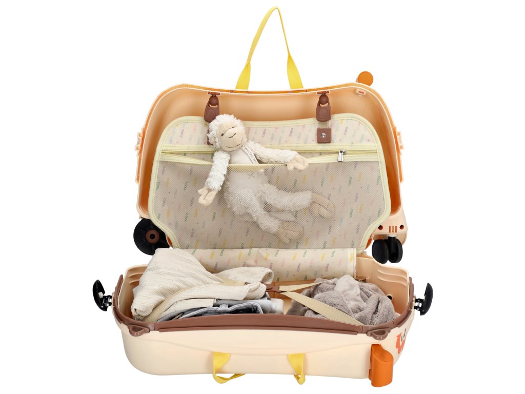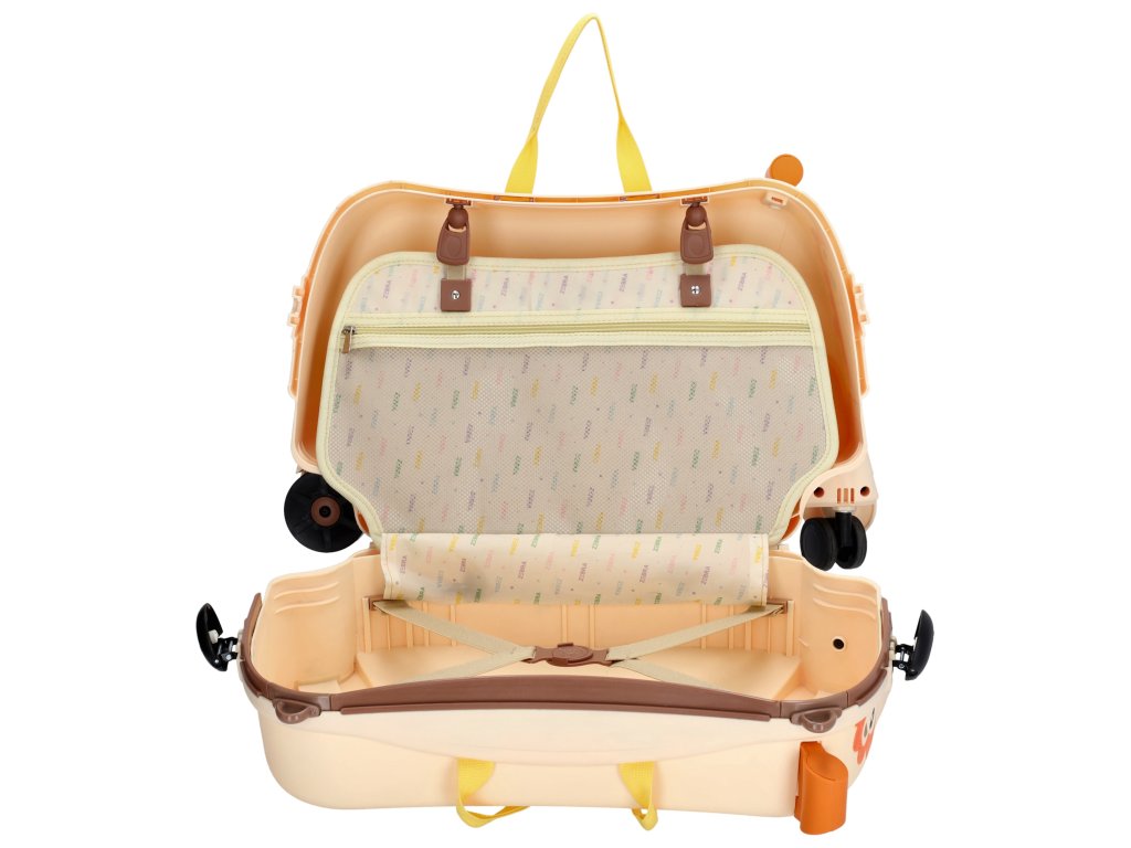 - Možnost sezení: pevná konstrukce umožňuje dítěti bezpečně si na kufr sednout.