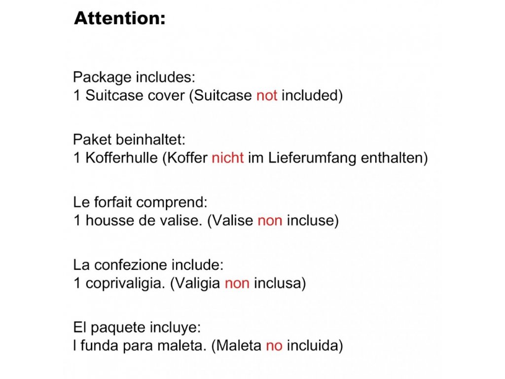 - Tento obal na zavazadla je vyroben s vynikající elasticitou a plynule se přizpůsobuje různým velikostem kufrů, čímž zajišťuje bezpečné uchycení a ochranu před poškrábáním a odíráním během cestování.