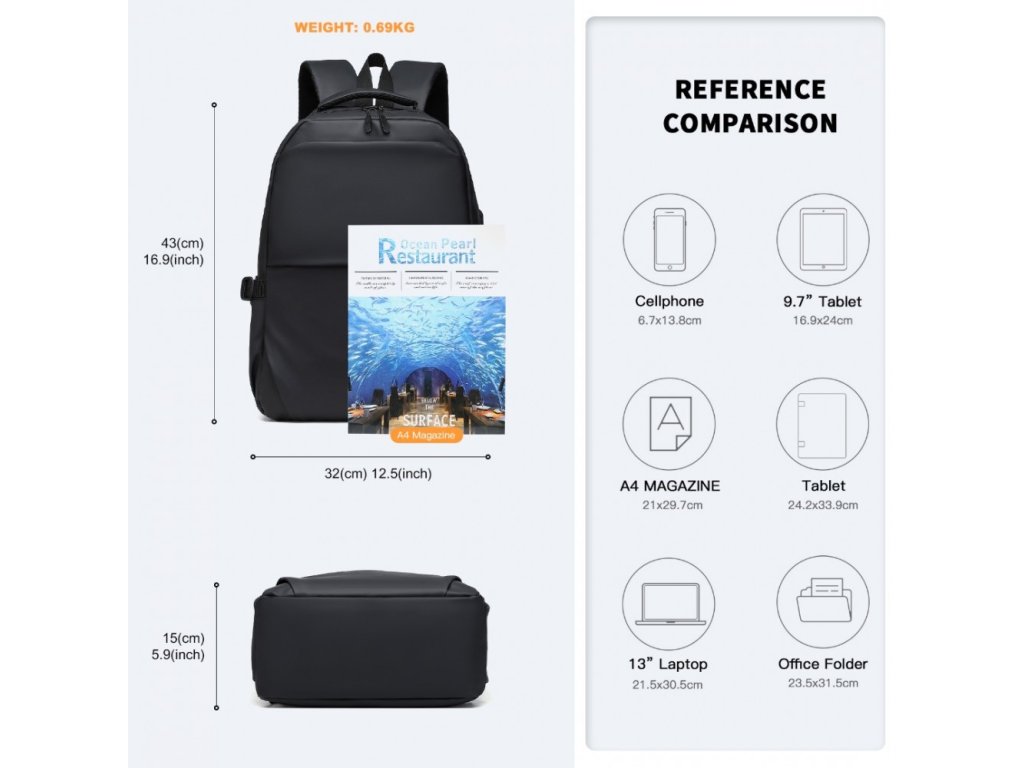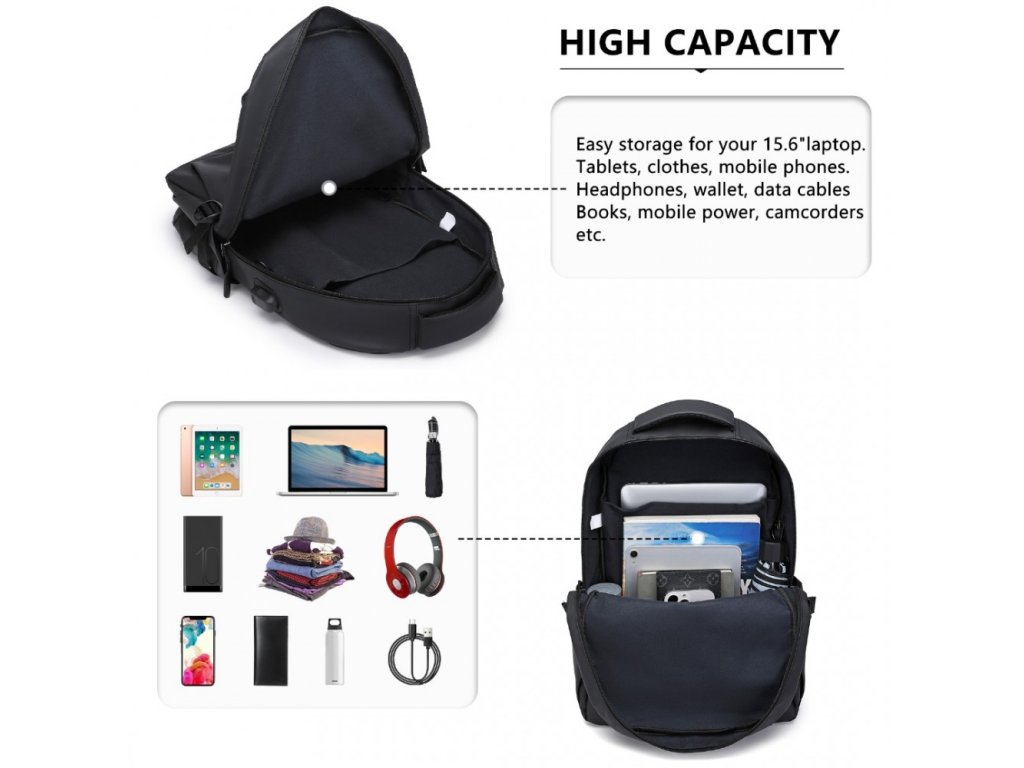 Dostatečně velký pro láhev s vodou, skládací deštník, digitální zařízení s časopisy A4 (15,6palcový notebook, poznámkový blok, tablet, powerbanka, Kindle) atd.