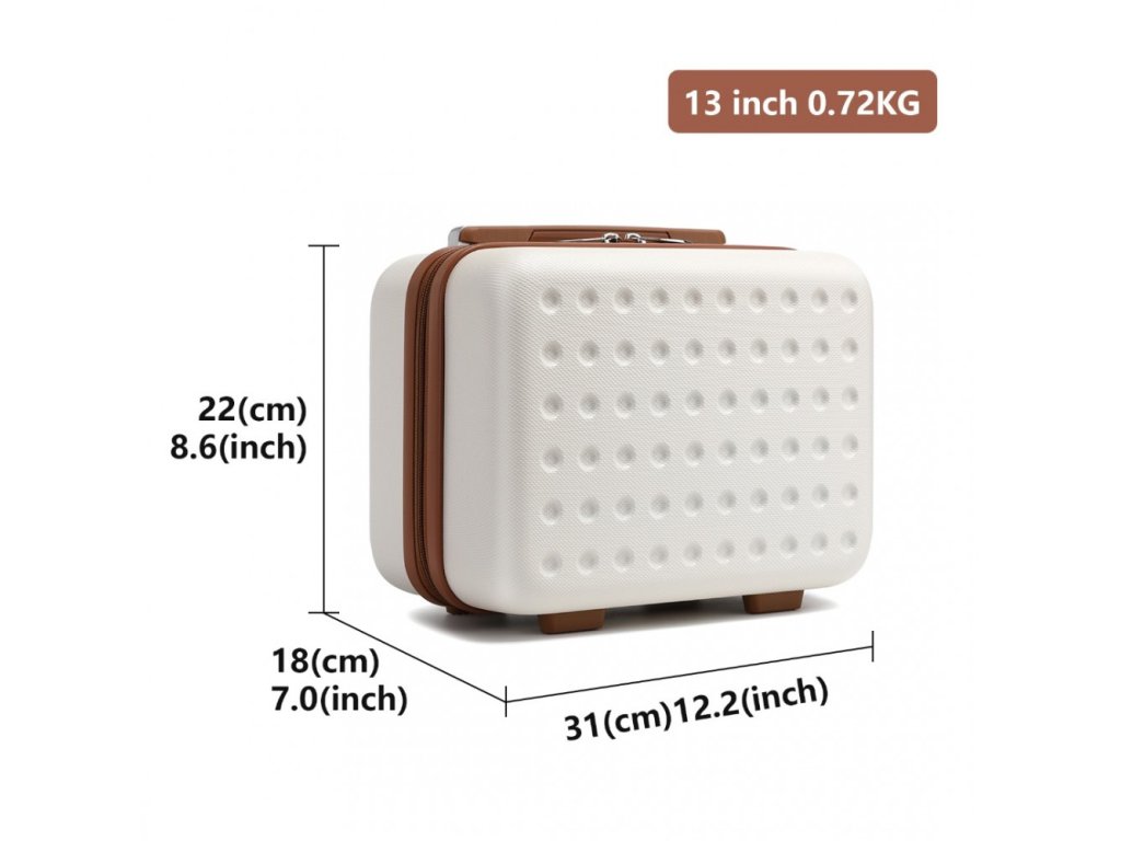 - Kosmetické pouzdro: 22 × 31 × 18 cm, 0,9 kg, kapacita přibližně 11 litrů.