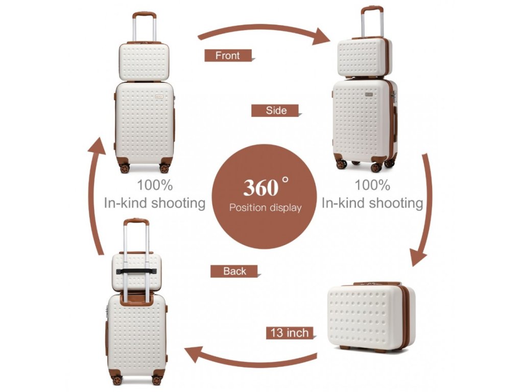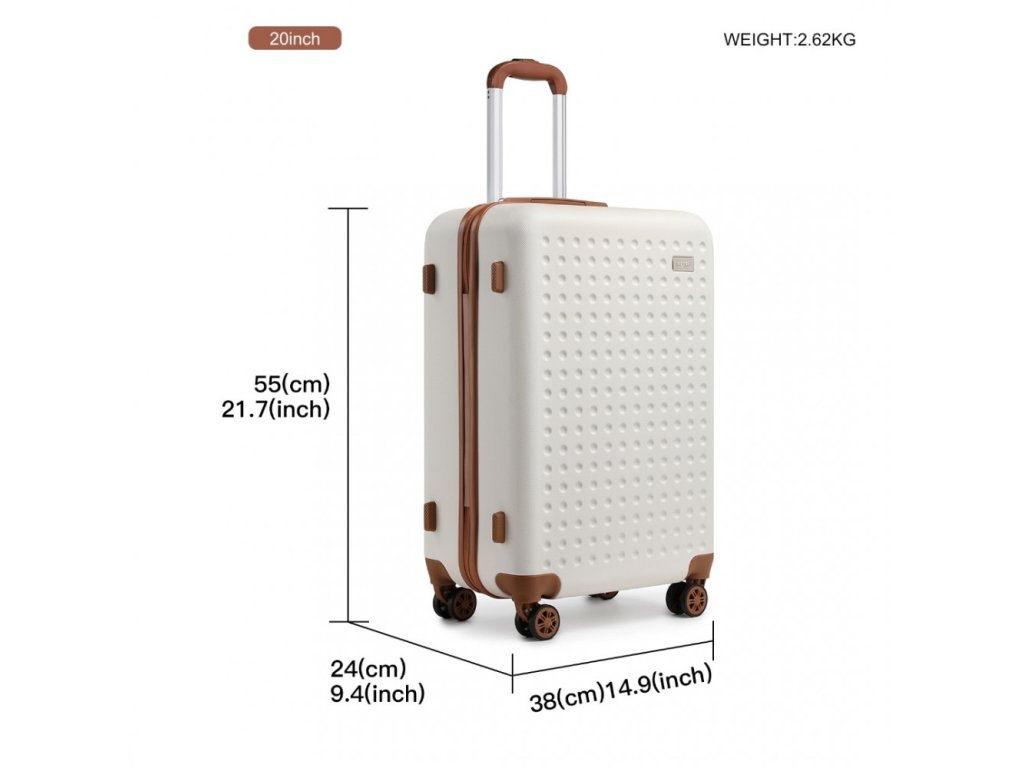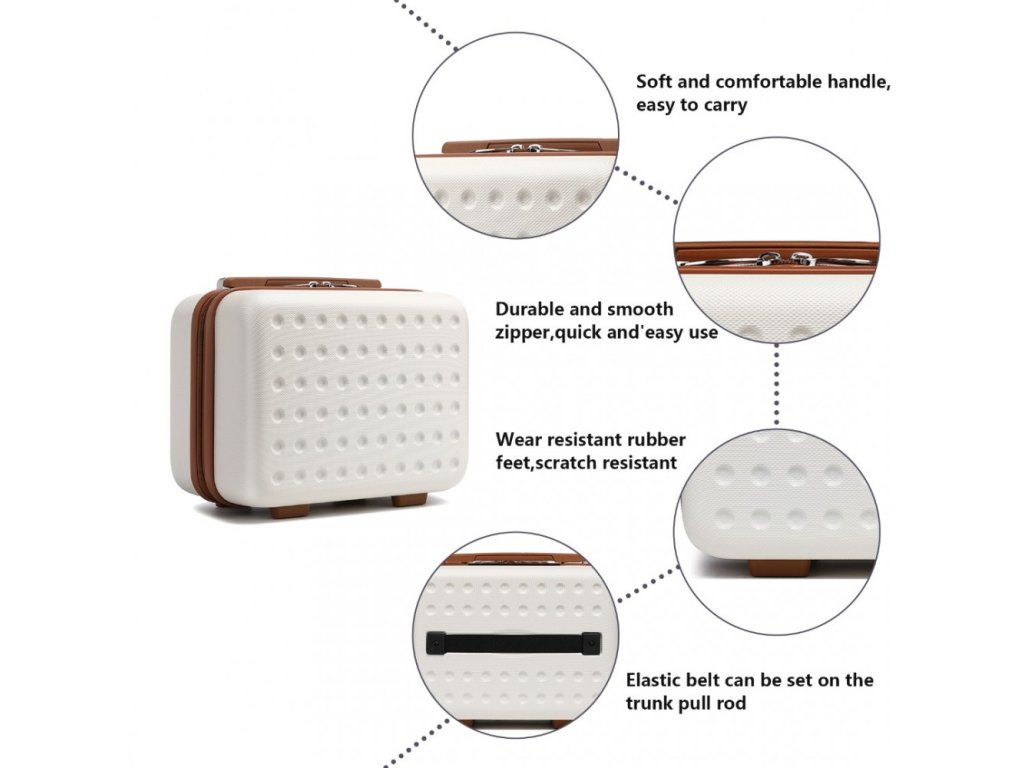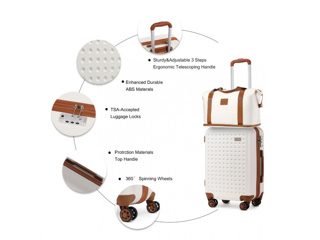 - Pevný skořepinový kufr: Vyroben z odolného ABS materiálu, který chrání vaše věci před nárazy a poškrábáním. Díky jedinečnému kruhovému vzoru a matnému povrchu si zachová stylový vzhled i po častém používání.