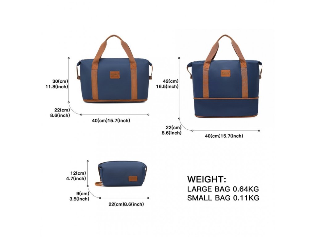 Sada cestovní tašky je vyrobena z voděodolné nylonové tkaniny s polyesterovým vnitřkem.