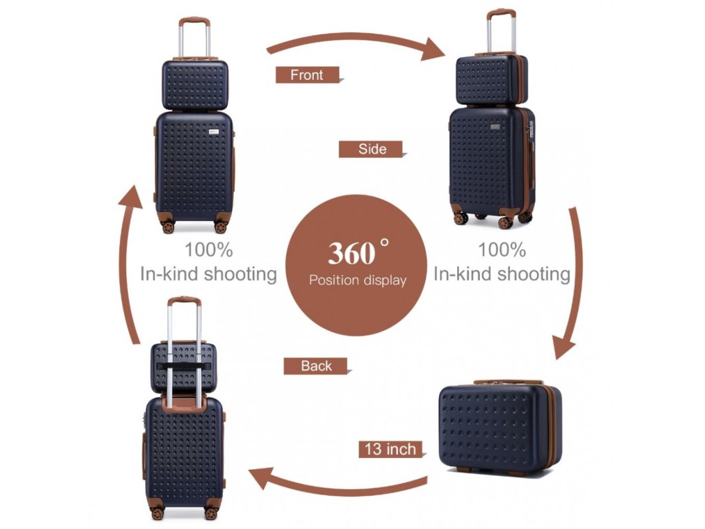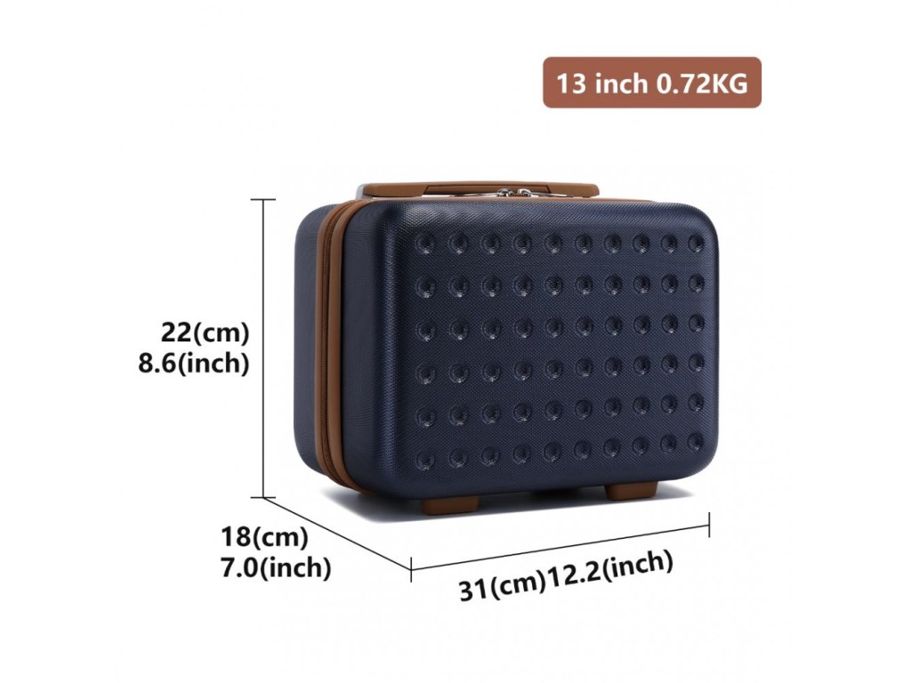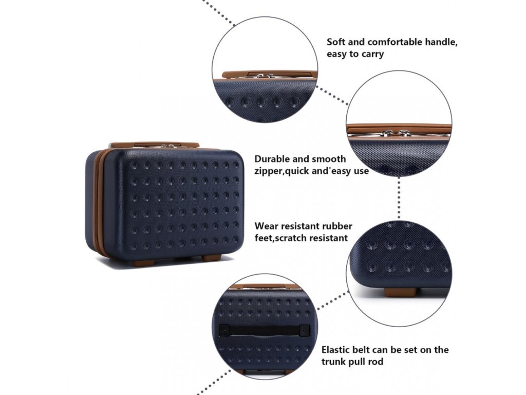 Kufr a kosmetické pouzdro jsou vyrobeny z vysoce kvalitního materiálu ABS, zatímco vnitřní přihrádky jsou vyloženy polyesterem.