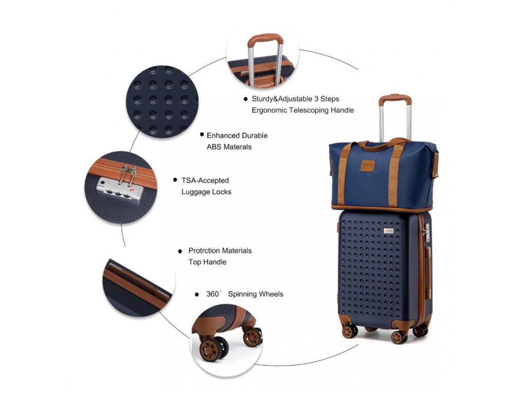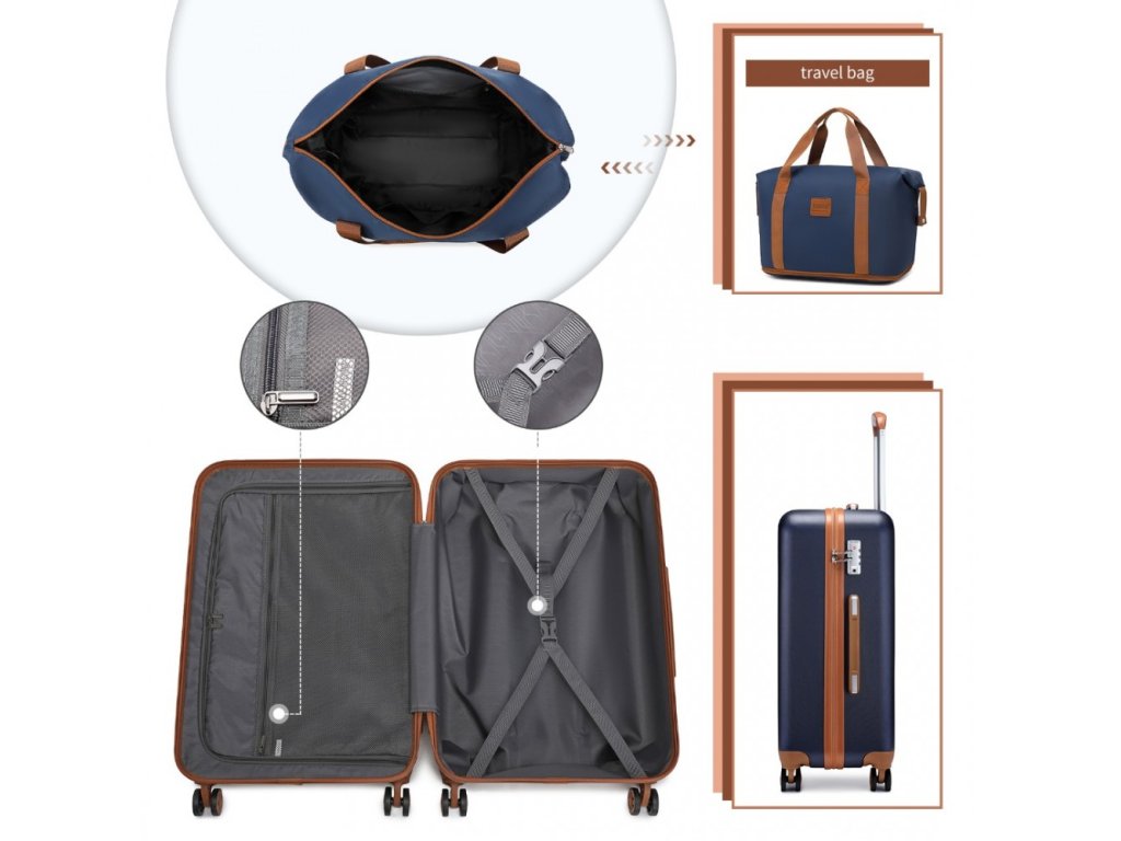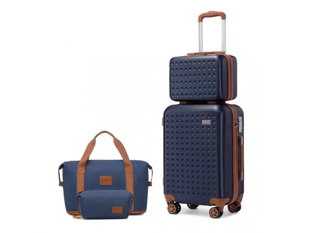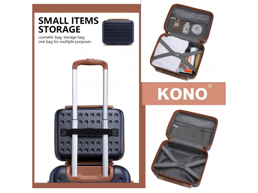 KONO 4 dílná cestovní sada kabinového kufru, toaletního pouzdra, cestovní tašky a kosmetické taštičky. Tato cestovní sada Kono nabízí komplexní řešení pro pohodlné a stylové cestování. V navy-hnědém provedení.