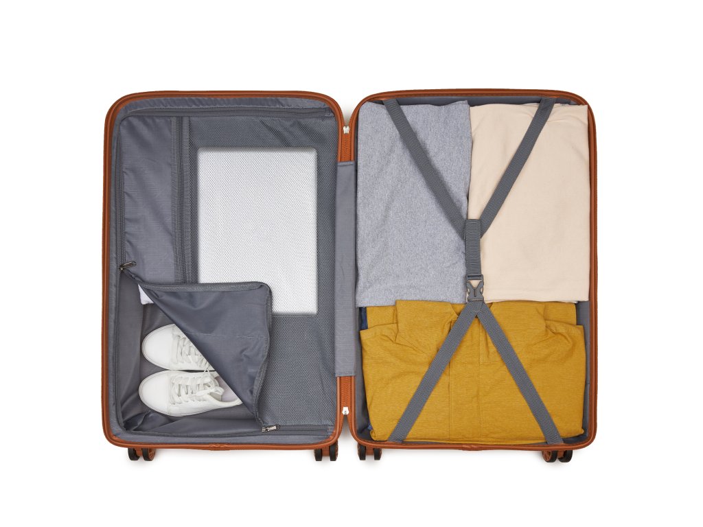 - 🧳 Chytré vnitřní uspořádání: Jedna strana s fixačními popruhy, druhá s celoplošnou síťovanou přepážkou a zipovou kapsou pro perfektní přehlednost.
