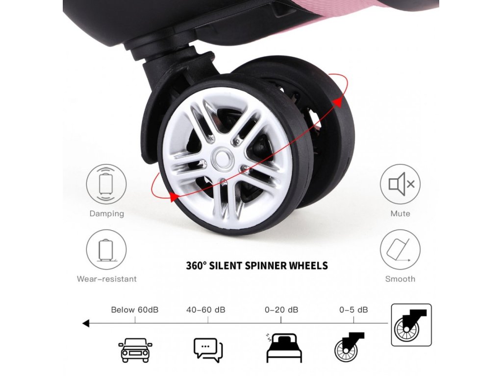 Kolečka otočná o 360° rovnoměrně rozloží váhu vašeho kufru a zajistí snadné klouzání po rušných letištích nebo železničních nádražích. Výsuvná, snadno uchopitelná teleskopická rukojeť s více nastaveními výšky.