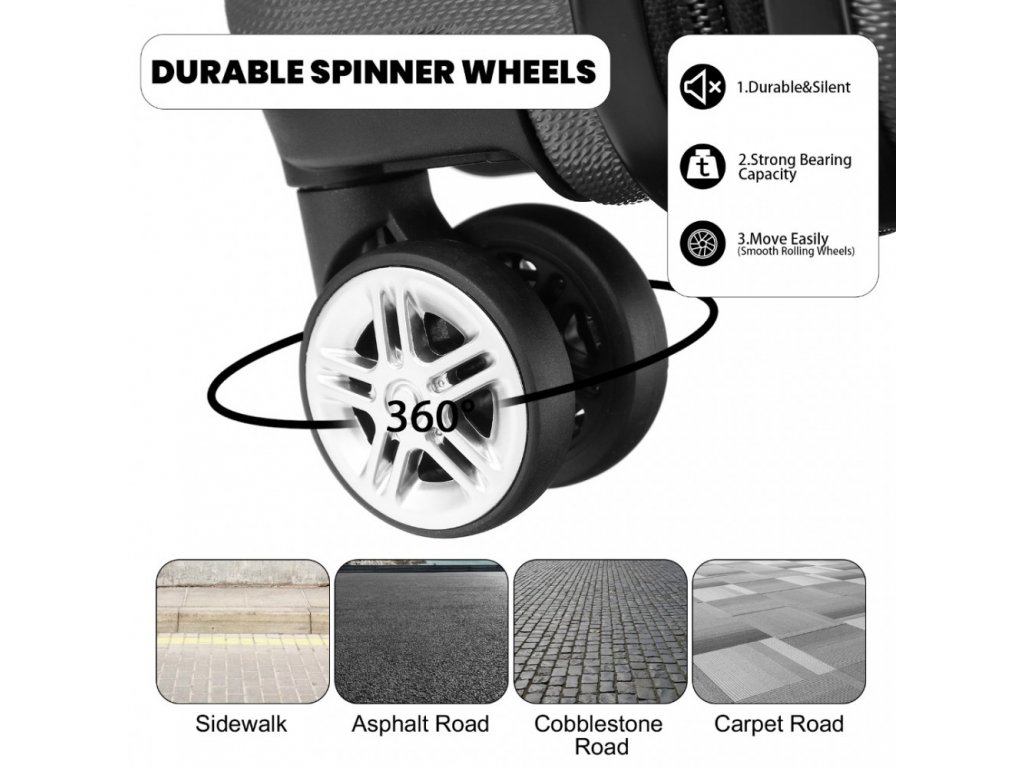 - Kolečka otočná o 360 ° rovnoměrně rozloží váhu vašeho kufru a zajistí snadné klouzání po rušných letištích nebo nádražích.