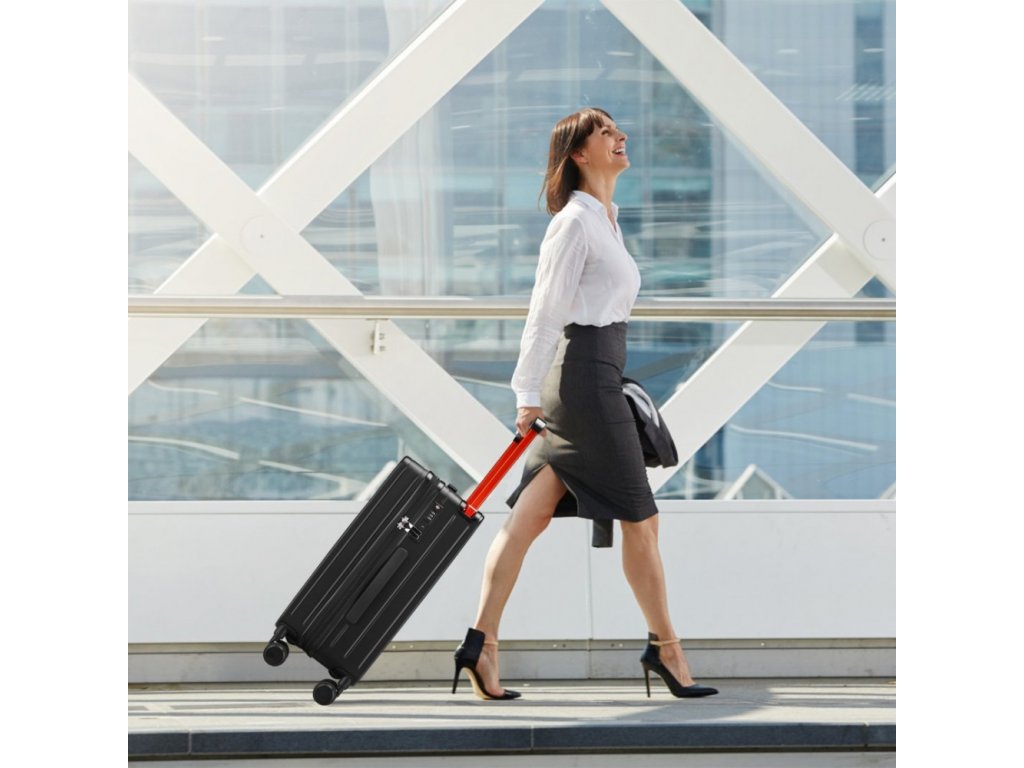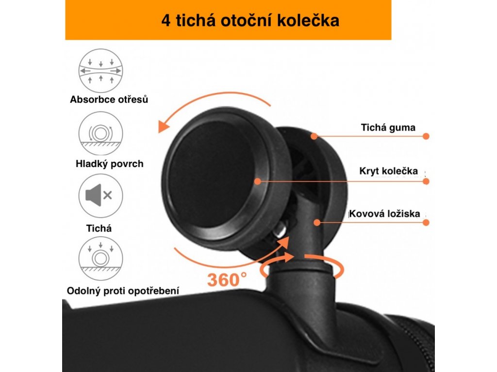 4 otočná kolečka otočná o 360 stupňů rovnoměrně rozloží váhu vašeho kufru pro snadné klouzání po rušných letištích nebo vlakových nádraží.