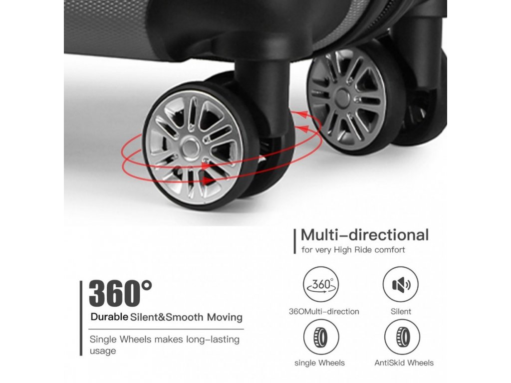 4 x 360° otočná kolečka rovnoměrně rozloží váhu vašeho kufru a zajistí snadné klouzání přes rušná letiště nebo železniční stanice.