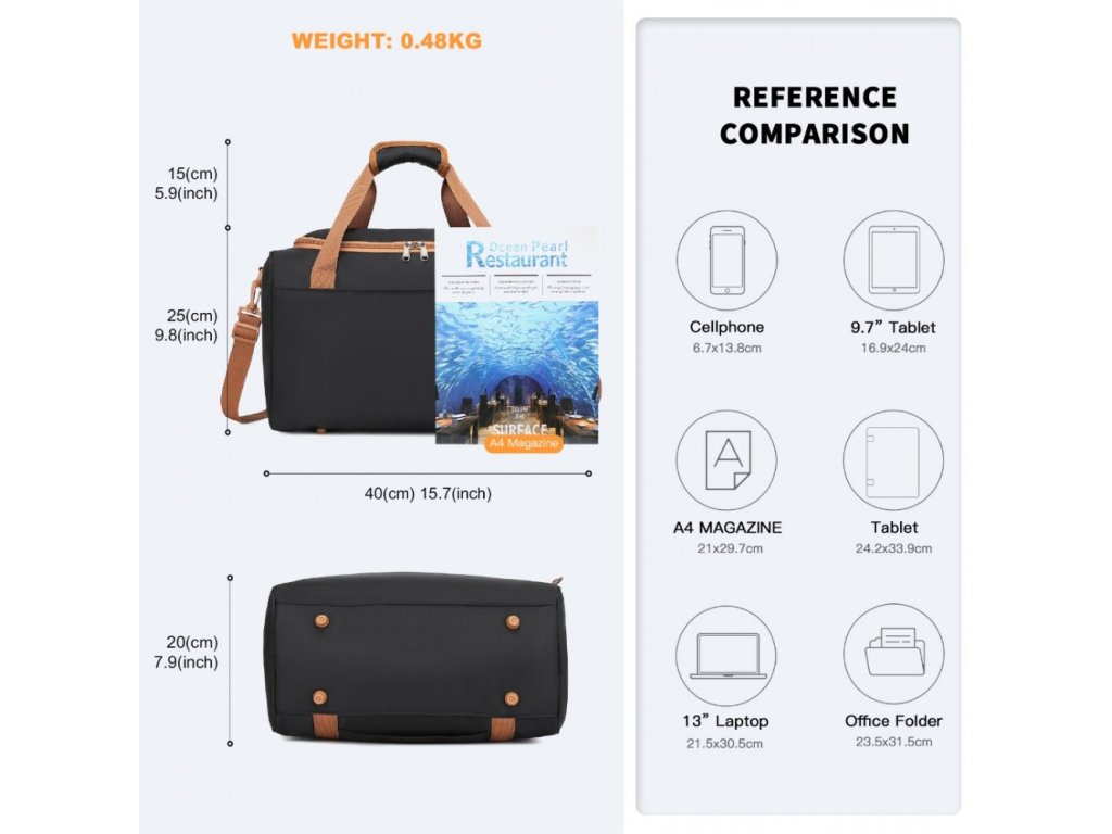 Dostatek prostoru pro všechny vaše nezbytnosti: oblečení, toaletní potřeby, telefon, peněženku, klíče atp. Do tašky se vejde množství digitálních zařízení včetně tabletu, Kindle, power banky atp.