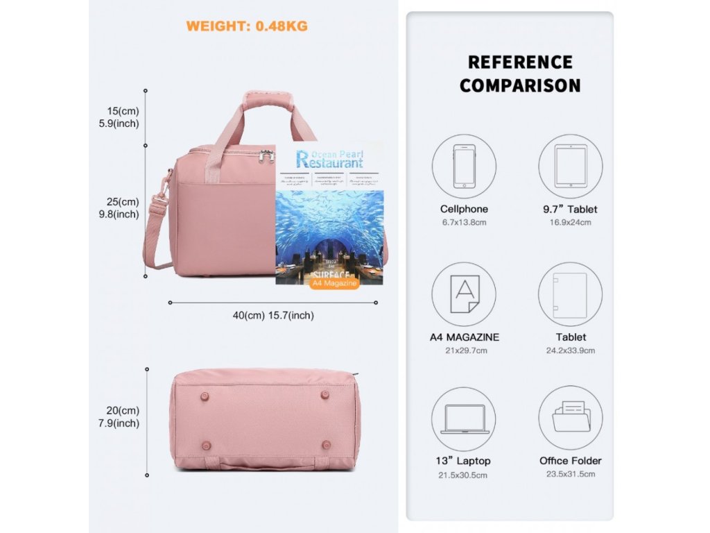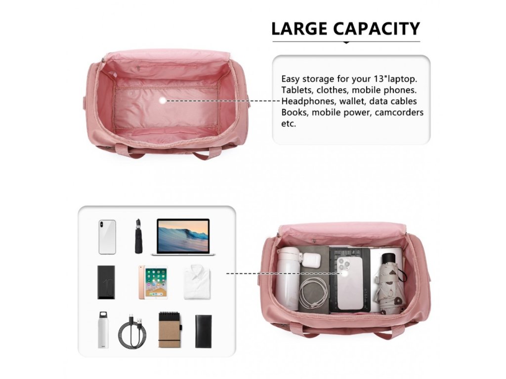 Dostatek prostoru pro všechny vaše nezbytnosti: oblečení, toaletní potřeby, telefon, peněženku, klíče atp. Do tašky se vejde množství digitálních zařízení včetně tabletu, Kindle, power banky atp.