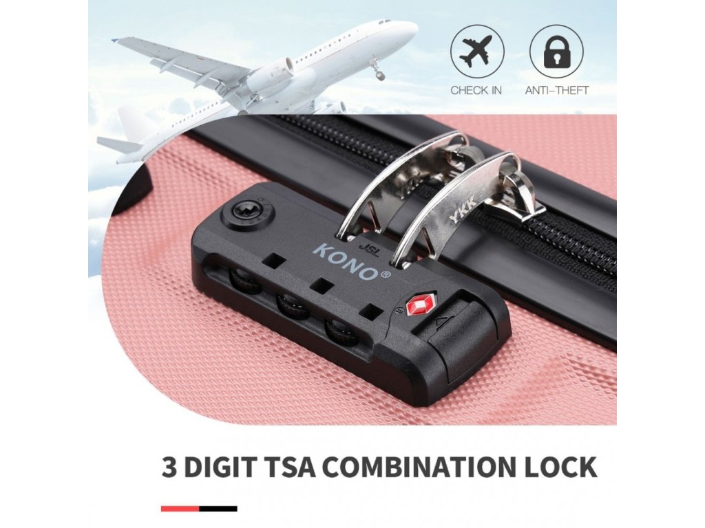 - Pevný kombinační zámek se 3 číselníky akceptovaný TSA, který nabízí maximální bezpečnost. Tento zámek umožňuje odemknutí a kontrolu vašich zavazadel bezpečnostními orgány bez poškození.