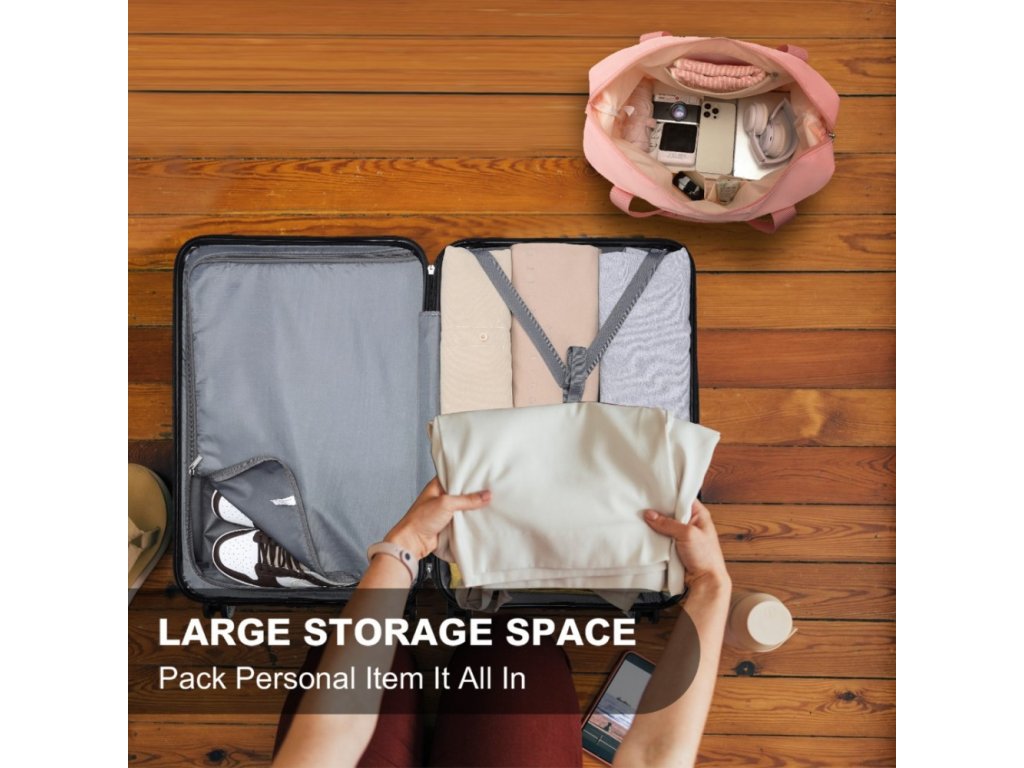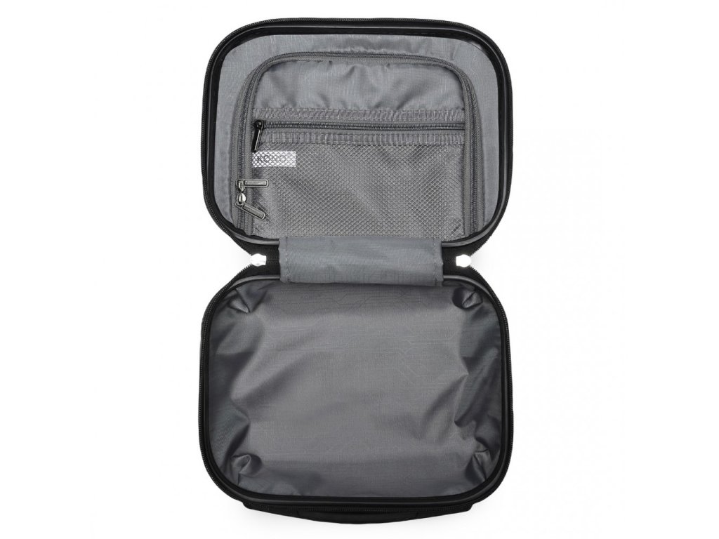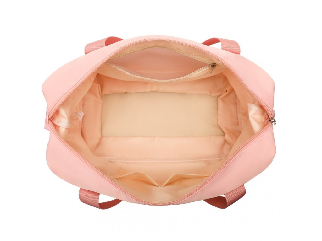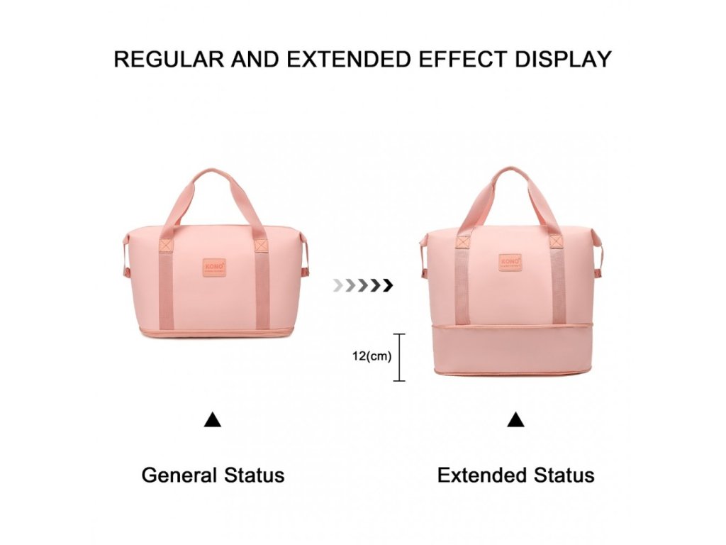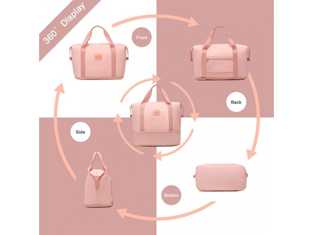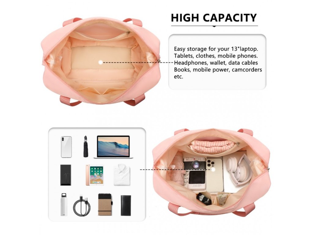 - Zip na spodní části tašky umožňuje zvýšit její kapacitu. Nabízí velkou hlavní přihrádku, oddělenou mokrou/suchou část a vyhrazené kapsy na drobné nezbytnosti. Zadní kapsa poskytuje rychlý přístup k osobním věcem, zatímco nylonový popruh umožňuje snadné připevnění k madlům zavazadel.