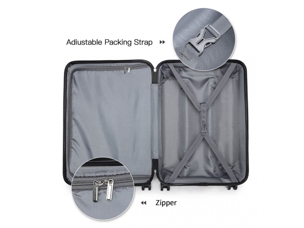 - Tato čtyřdílná sada obsahuje velký kufr s pevnou skořepinou, kompaktní příruční zavazadlo, všestrannou tašku a toaletní tašku.