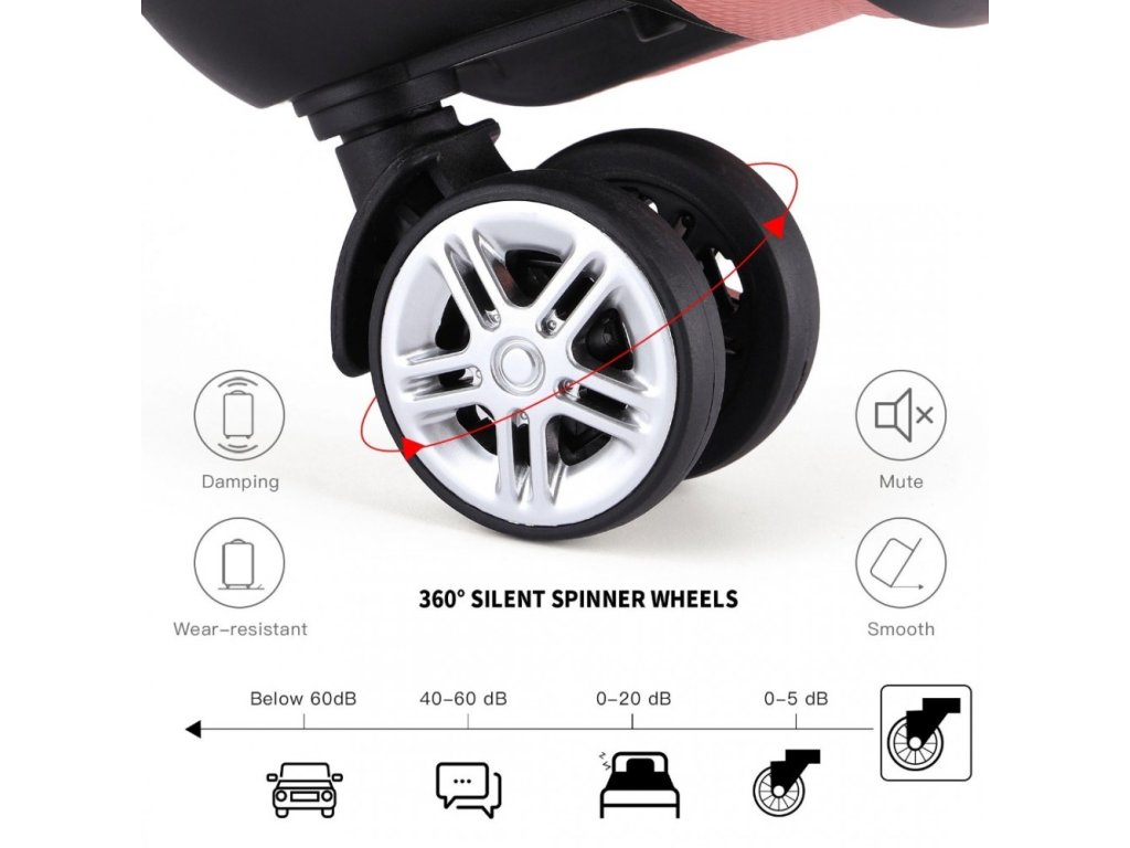 - Kolečka otočná o 360 ° rovnoměrně rozloží váhu vašeho kufru a zajistí snadné klouzání po rušných letištích nebo nádražích.