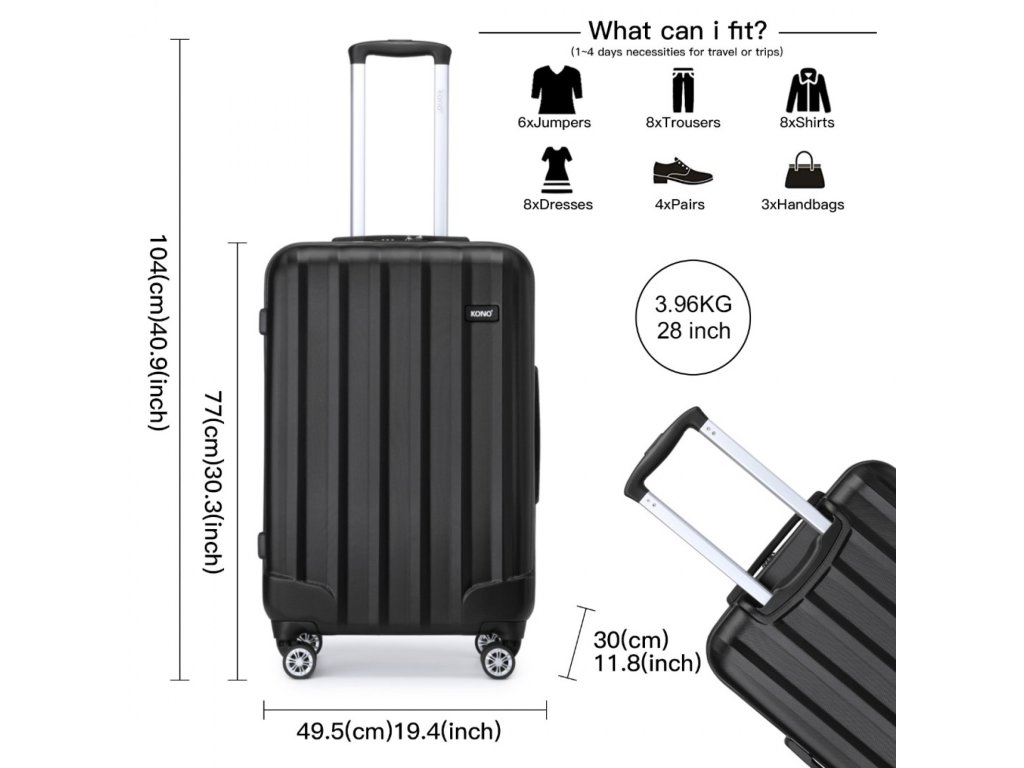 28 palců - 77 cm (V) * 49,5 cm (Š) * 30 cm (H) ; 3,96 kg, přibližně 114 litrů