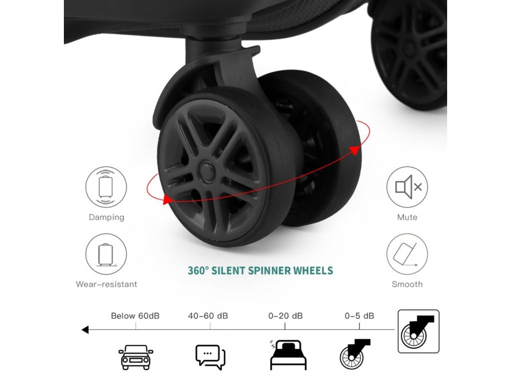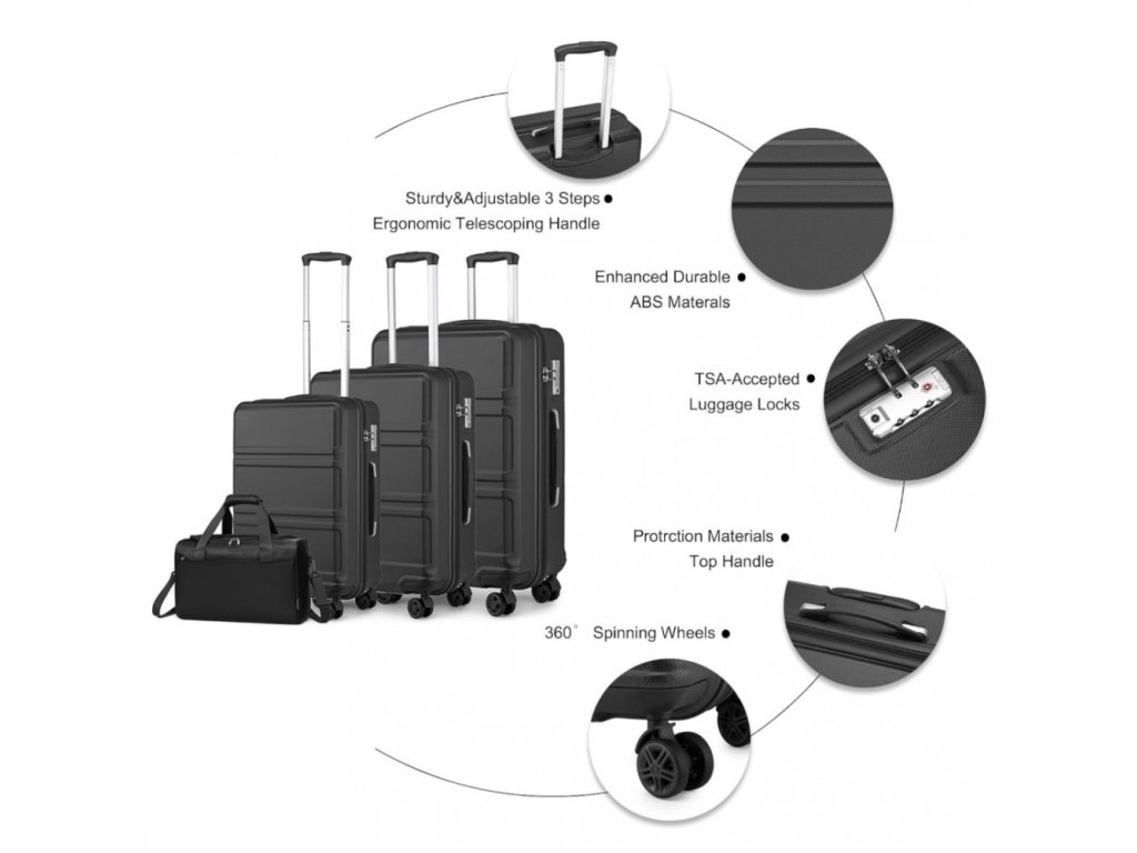 Set 3 skořepinových kufrů v různých velikostech s cestovní taškou. Set kufrů je vyroben z vysoce kvalitního materiálu ABS s vestavěným TSA bezpečnostním zámkem. S touto stylovou a funkční sadou zavazadel můžete cestovat s jistotou a lehkostí. V černém provedení.