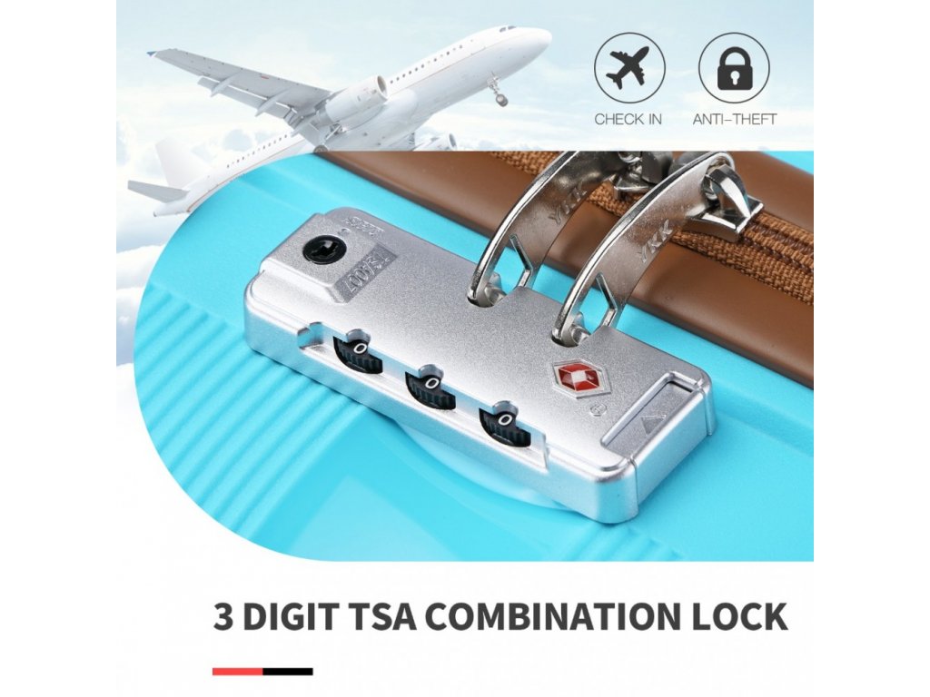 - Pevný kombinační zámek se 3 číselníky akceptovaný TSA, který nabízí maximální bezpečnost. Tento zámek umožňuje odemknutí a kontrolu vašich zavazadel bezpečnostními orgány bez poškození.