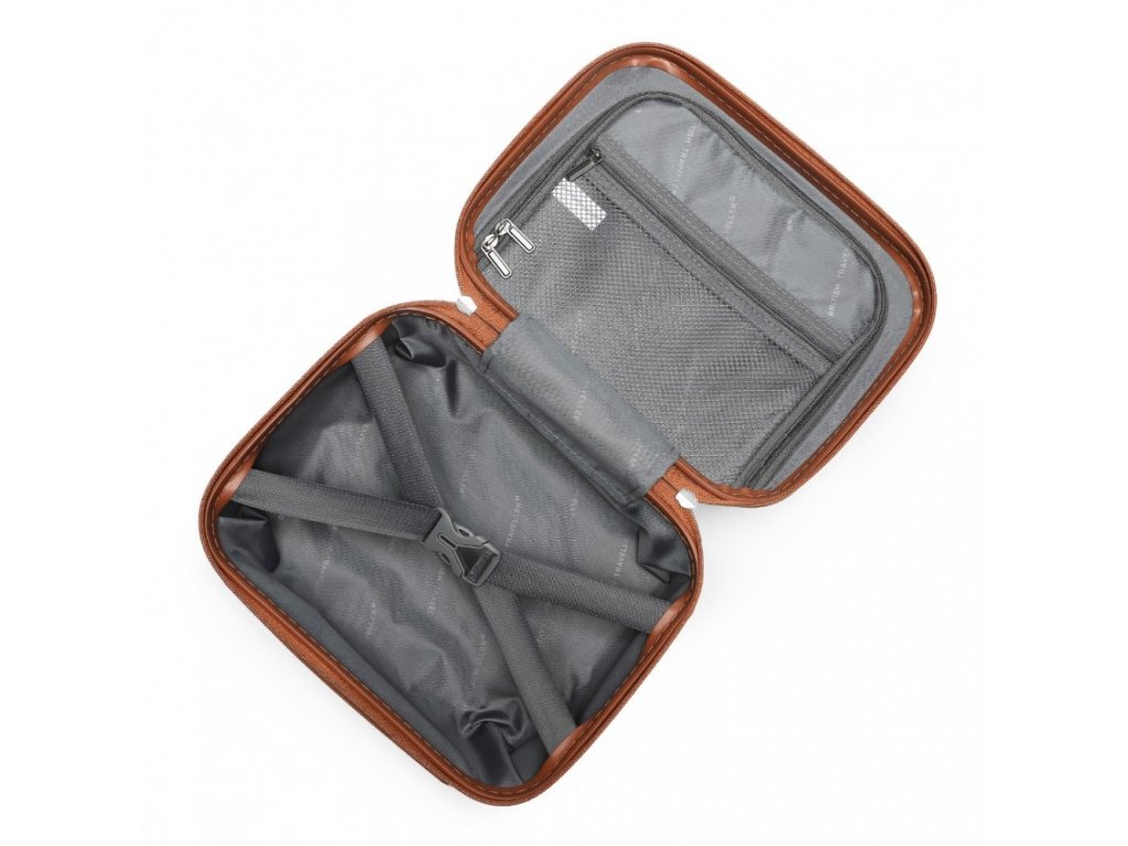 - Uvnitř elastický pásek udrží větší předměty, jako jsou produkty péče o pleť a make-up, bezpečně během cestování, zatímco část se zipem na opačné straně bezpečně uloží menší nezbytnosti, jako jsou štětce, rtěnky a oční stíny.