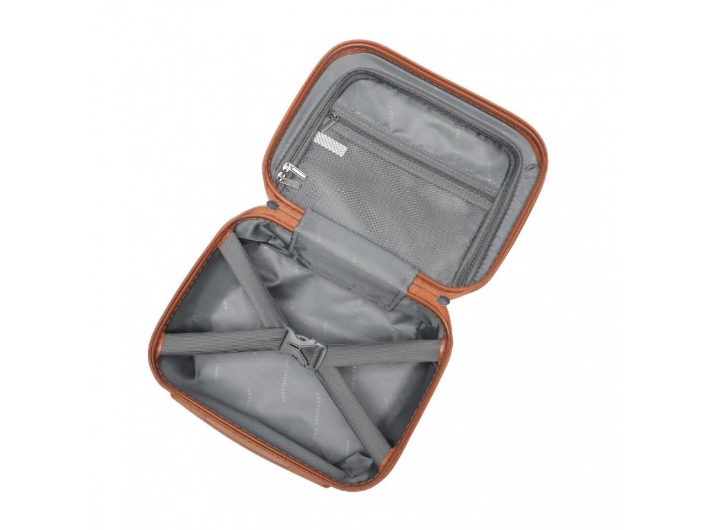 - Uvnitř elastický pásek udrží větší předměty, jako jsou produkty péče o pleť a make-up, bezpečně během cestování, zatímco část se zipem na opačné straně bezpečně uloží menší nezbytnosti, jako jsou štětce, rtěnky a oční stíny.