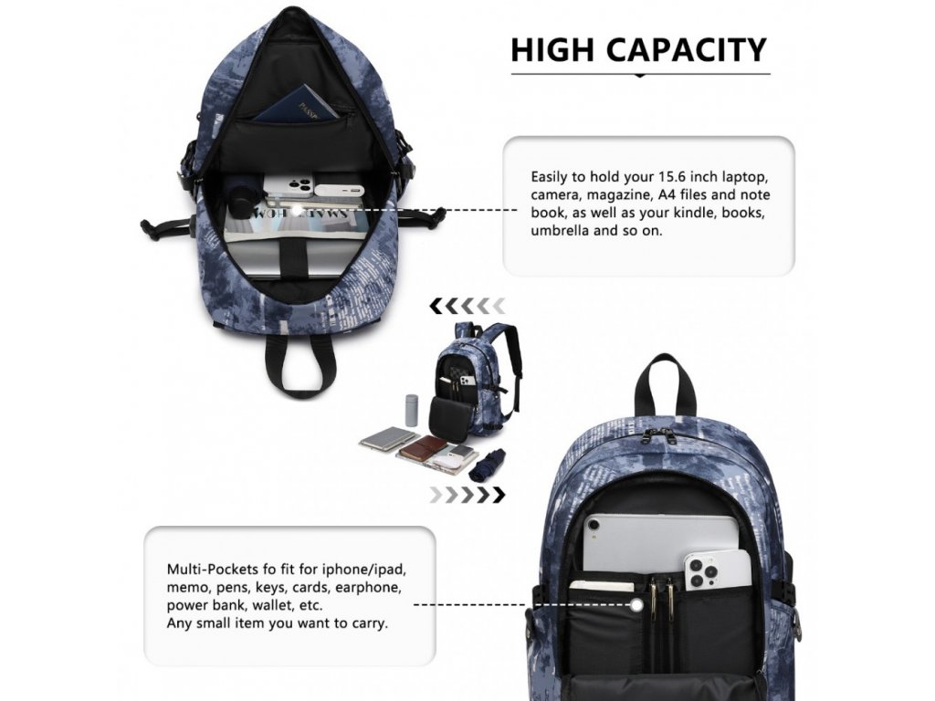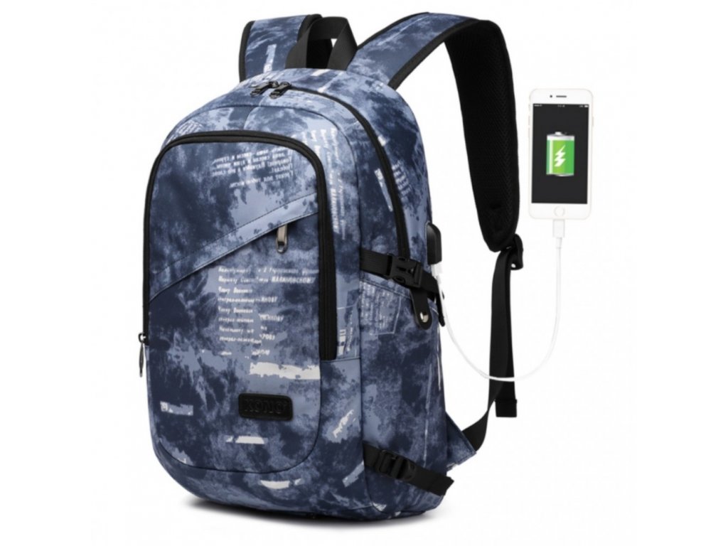 KONO unisex batoh s USB portem - modrý potisk - 20L