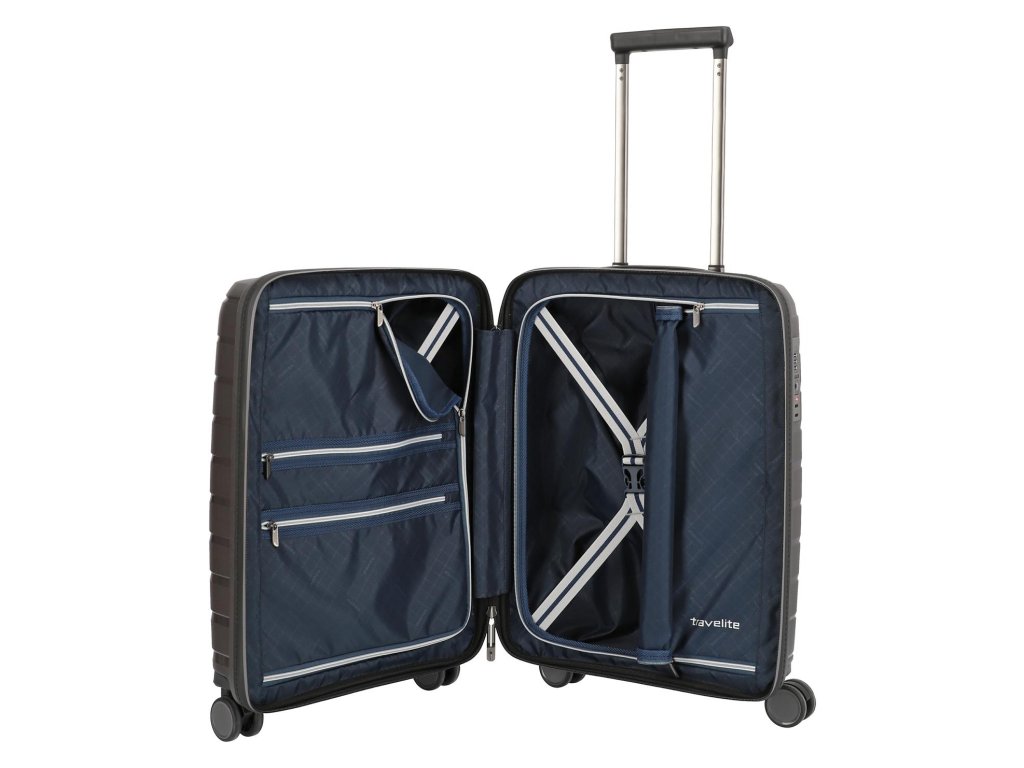 Uvnitř kufru najdete oboustranný balicí systém s kompresními popruhy v obou částech, které udrží oblečení na místě i během přepravy. Dvě dělicí příčky na zip usnadňují přehledné rozdělení věcí, zatímco vnitřní kapsy na zip jsou ideální pro drobnosti a cestovní doplňky. Celý interiér je opatřen kvalitní textilní podšívkou, která chrání uložené věci a zároveň dodává kufru elegantní vzhled.