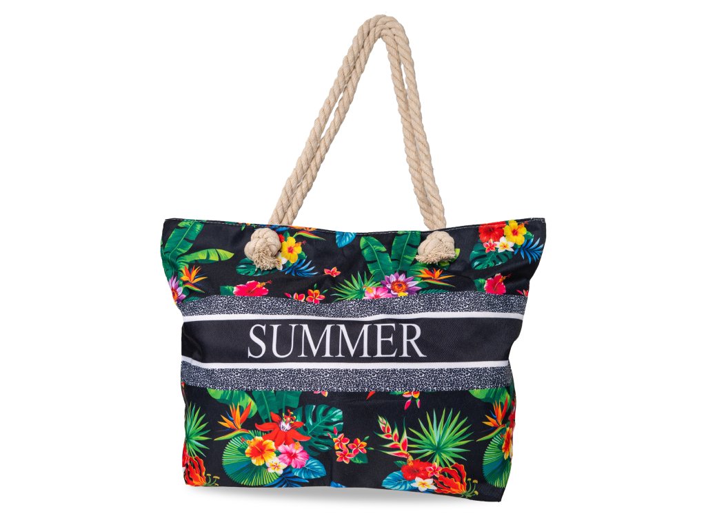 Vyrazte na pláž stylově s touto letní plážovou taškou! Elegantní taška v černém provedení s barevnými květinami a nápisem SUMMER, která jí dodává letní šmrnc. Vyrobena z pevného polyesterového materiálu, spodní část z pytloviny a ucha imitující lodní lana, je nejen módní, ale i odolná.
